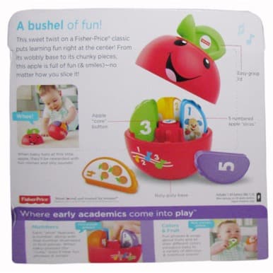 This is a Laugh & Learn Learning Happy Apple from Fisher-Price, a great pick for learning and fun in one! It teaches numbers, colours, fruits and more. This sweet twist on a Fisher-Price classic puts learning fun right at the centre! From its wobbly base to its chunky pieces, this apple is full of fun and smiles - no matter how you slice it! This toy is for babies from six (6) months to thirty-six (36) months. This is also a fantastic gift choice for newborn, birthday etc