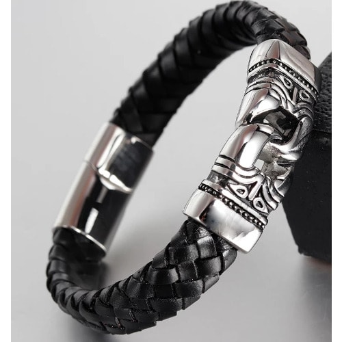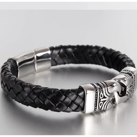 Black braided Classic Genuine Leather Metal Men's Bracelet well woven and finely hand crafted and manufactured to perfection to go well with any kind of oufit and highly durable to withstand any kind of weather quality of the finest at hand and complete light weight on the wrist .it also comes with a smooth stainless steel metallic alloy clasp which helps to fasten the bracelet to your wrist firmly which is well made which also gives it a dynamic and very stylish and bold look .100% and also witha magentic buckle