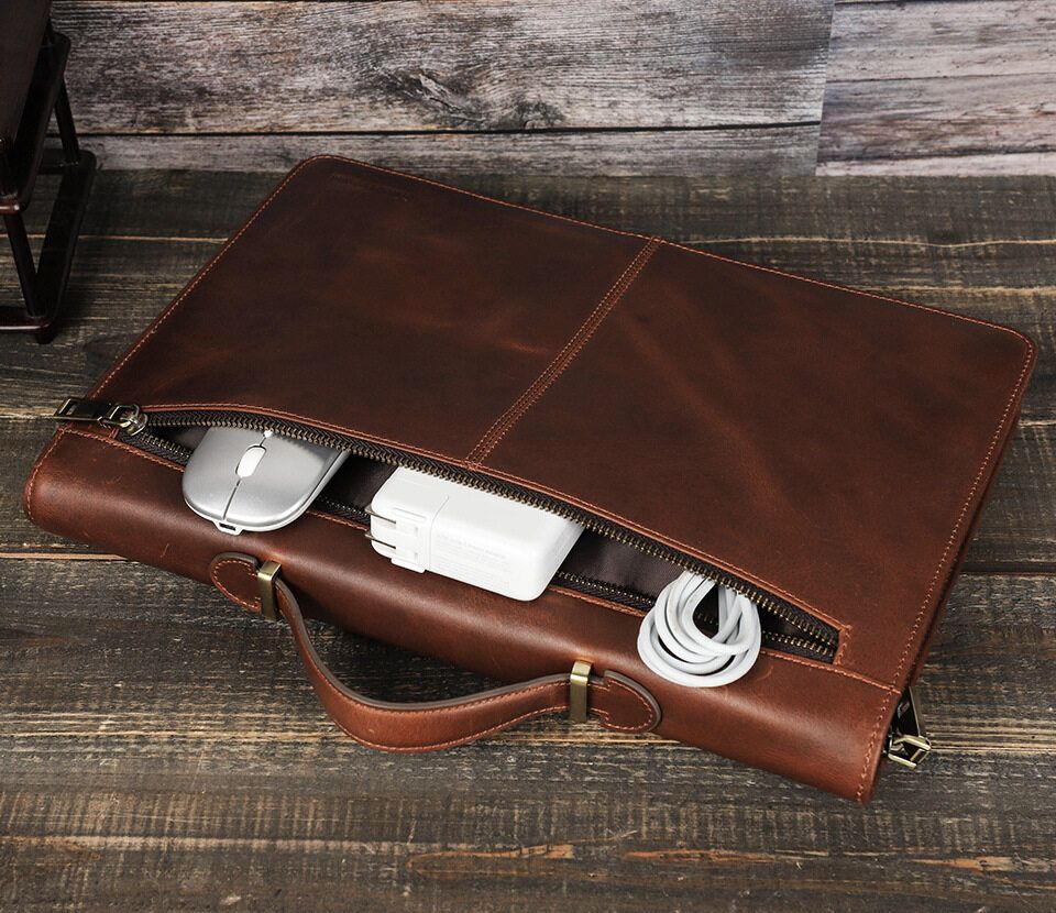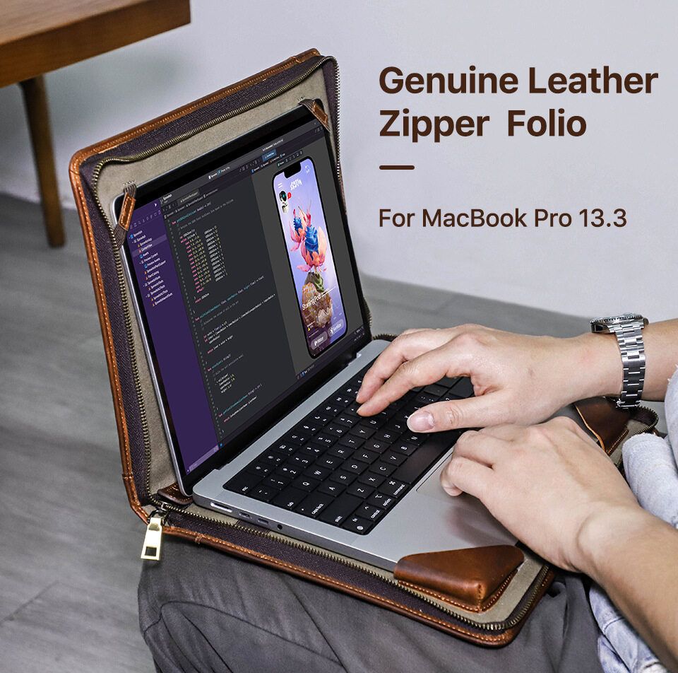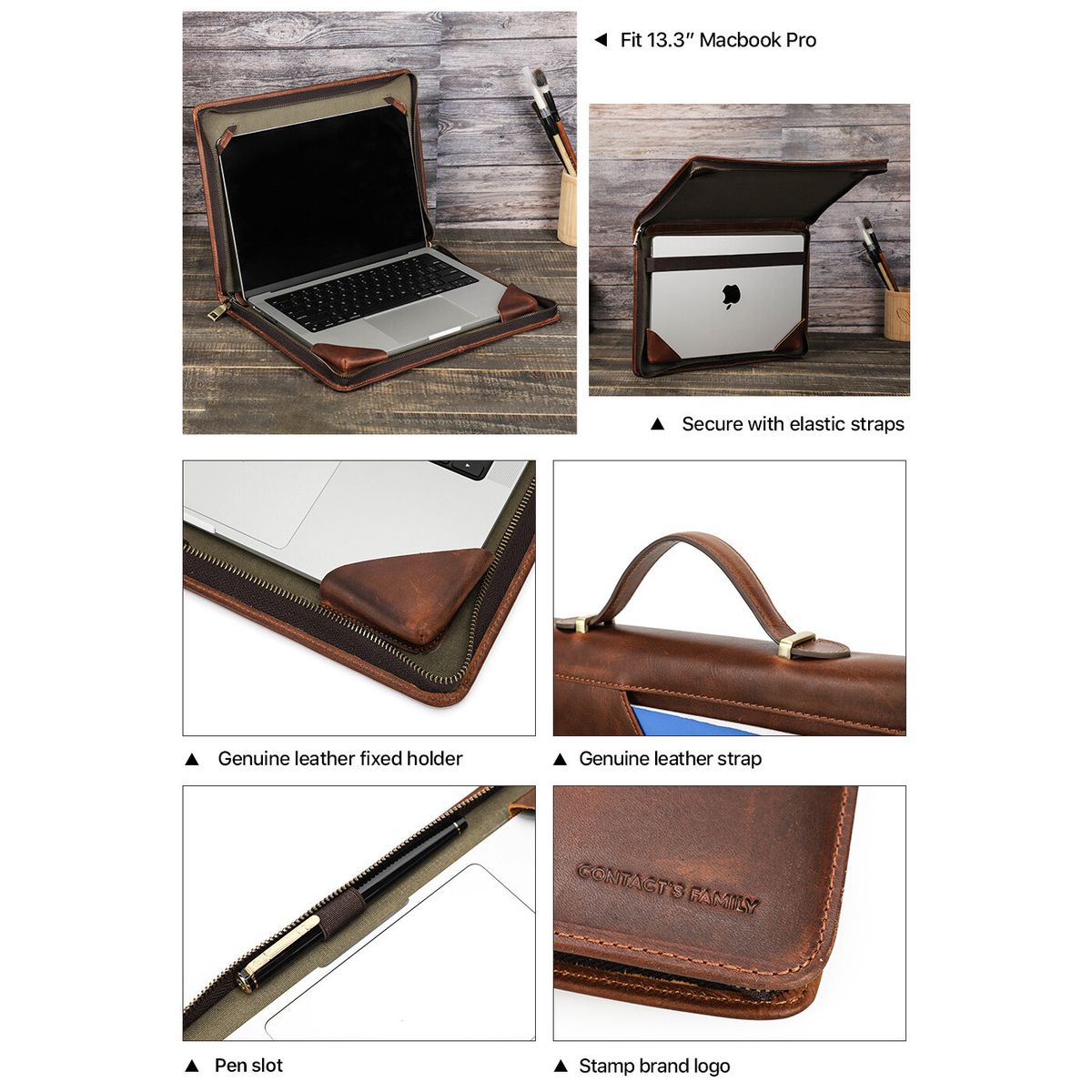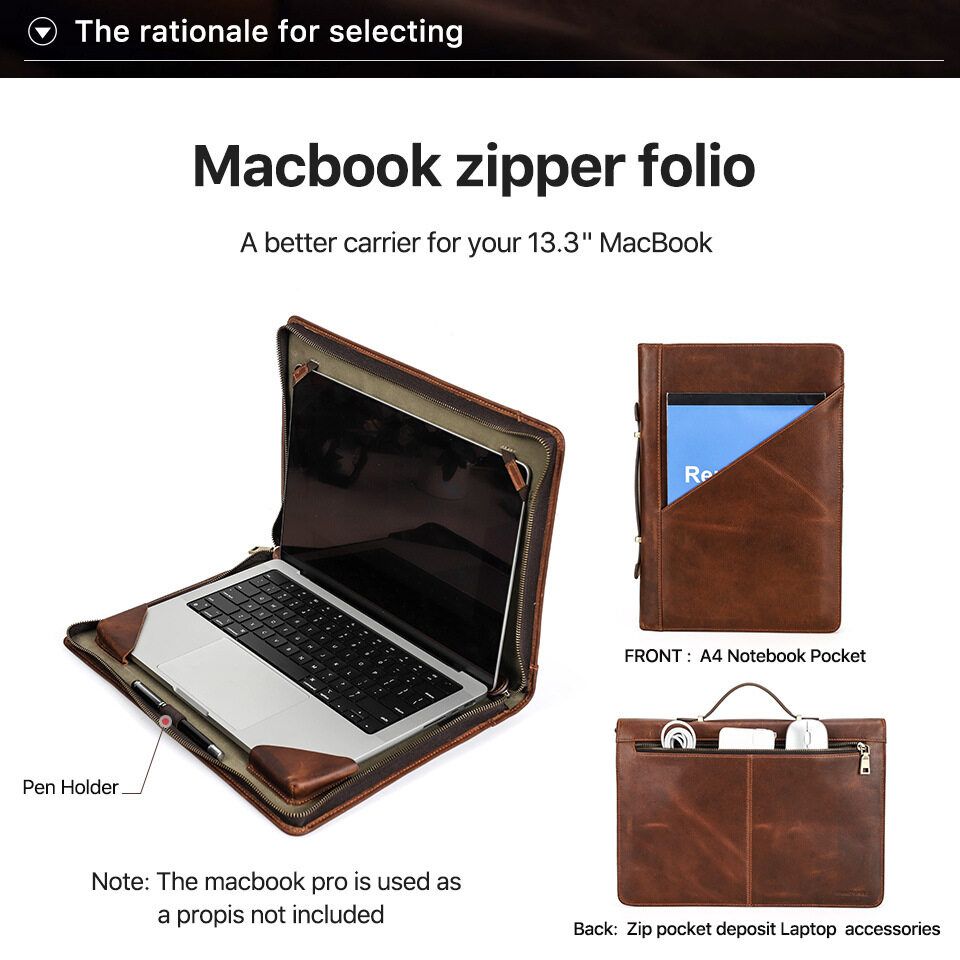 Leather Business Case for For Macbook Air 13.3 Inch Genuine Leather Zipper Folio with Pen Slot Multifunctional Laptop Leather Case