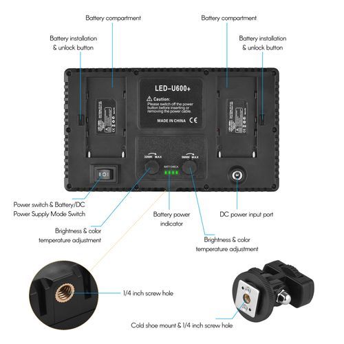 A high-quality professional photography light panel with 600pcs light beads, bi-color temperature 3200-5600K, dimmable brightness, high CRI 95, integrated barndoor, rotatable cold shoe ballhead and 1/4 inch screw hole interface, perfect for outdoor photography, studio photography, product photography, live stream, video conference, makeup, etc. Come and buy now, don't miss this wonderful product!