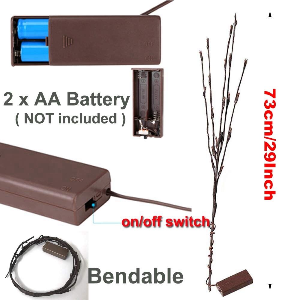 LED Branches Powered Decorative Lights Tall Vase Filler Willow Twig Lighted Branch for Home Decoration - 29 Inches 20 LED Lights (Branches Light)Features:Application: Perfect For Home, Bedroom, Living Room, Balcony, Balcony Window, Office Room, Children's Room, Restaurant, Porch, Pavilion, Shelf, For Christmas, New Year, Parties, Birthday Parties, Wedding Ceremony, Dinner Party Decoration.Specifications:: Warm White / Cool White / Blue / Purple / Pink / ColorLength: 73cm/29InchesLED Bulb: 20pcsVoltage: 3VWaterproof Grade: IP44BATTERY OPERATED: 2X AA (NOT INCLUDED)Material: PlasticPackage Included:1x 29Inches LED Willow Branch Lamp