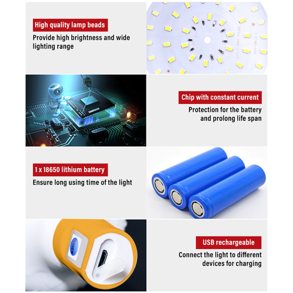 USB RECHARGEABLE: Equipped with a large capacity battery, the light can last for 4-8 hours. Comes with a USB cable, you can recharge the light by connecting it to laptop, power-bank, charger and so on through the USB cable.