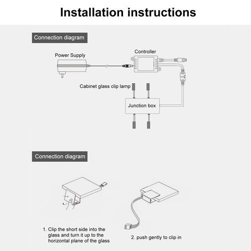 The robust clips are mounted onto the edge/side of glass. Suitable for under-cabinet, bar, wardrobe, cupboard, shelf lighting, etc.