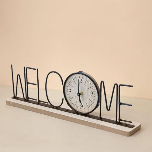 WELCOME CLOCK DECOR STAND.Colours available: BLACK.Beautiful decor accessory .Home/Office/Hotel/Lounge decor accent..Material: Metal and Wood.The clock works. It requires 1AA battery (not included).