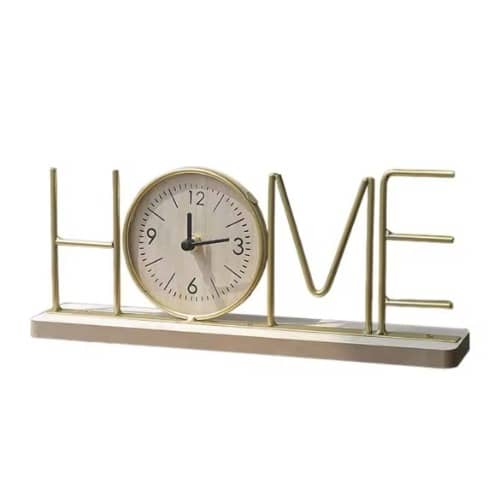 HELLO CLOCK DECOR STAND.Colours available: Gold.Beautiful decor accessory .Home/Office/Hotel/Lounge decor accent..Material: Metal and Wood.The clock works. It requires 1AA battery (not included)..