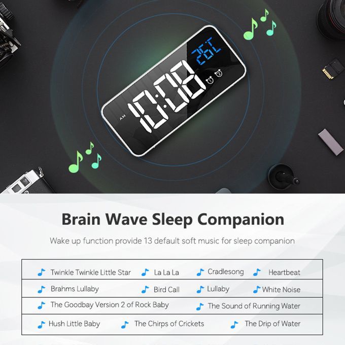 Multifunctional Clock: Large LED Scree, USB supply, snooze mode, 40 alarm music, 24 hours/12 hours conversion, temperature display with ?C and ?F,4 screen brightness adjustable, 13 relax and sleep songs, Voice-controlled energy-saving mode.