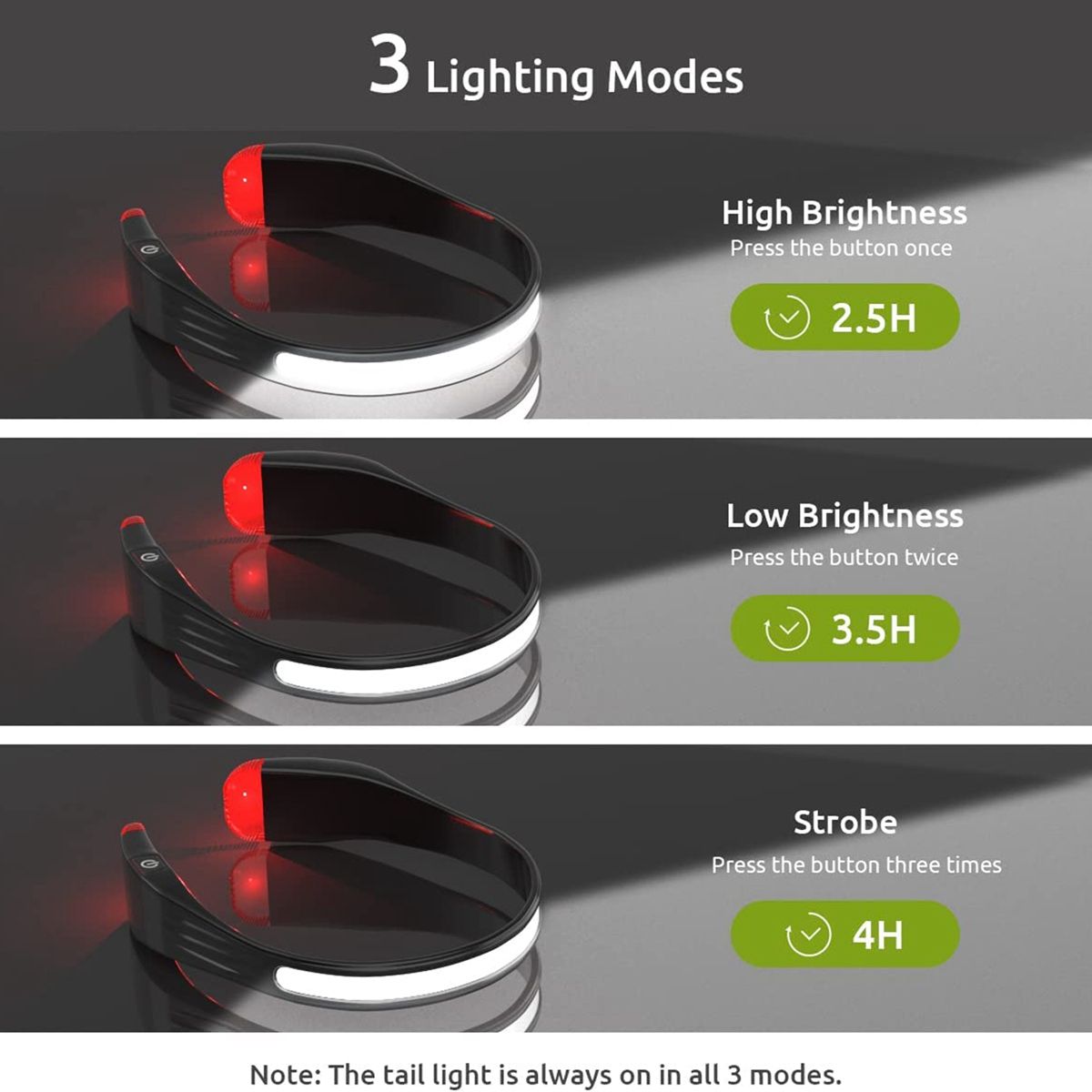 3 Light Modes - The Head Light Lamp has 3 light modes and is easy-to-operate, press the button to switch between High Brightness/Low Brightness/Strobe/Off. The tail light is always on in all 3 modes.