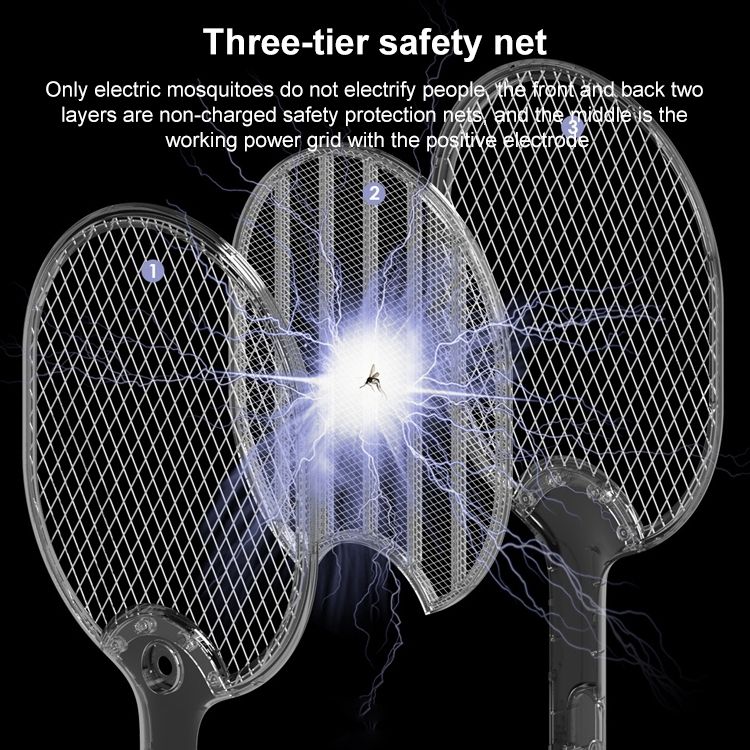 2. Features: three-layer protection grid, fast mosquito elimination, large handle buttons, double safety switches, LED lighting assistance