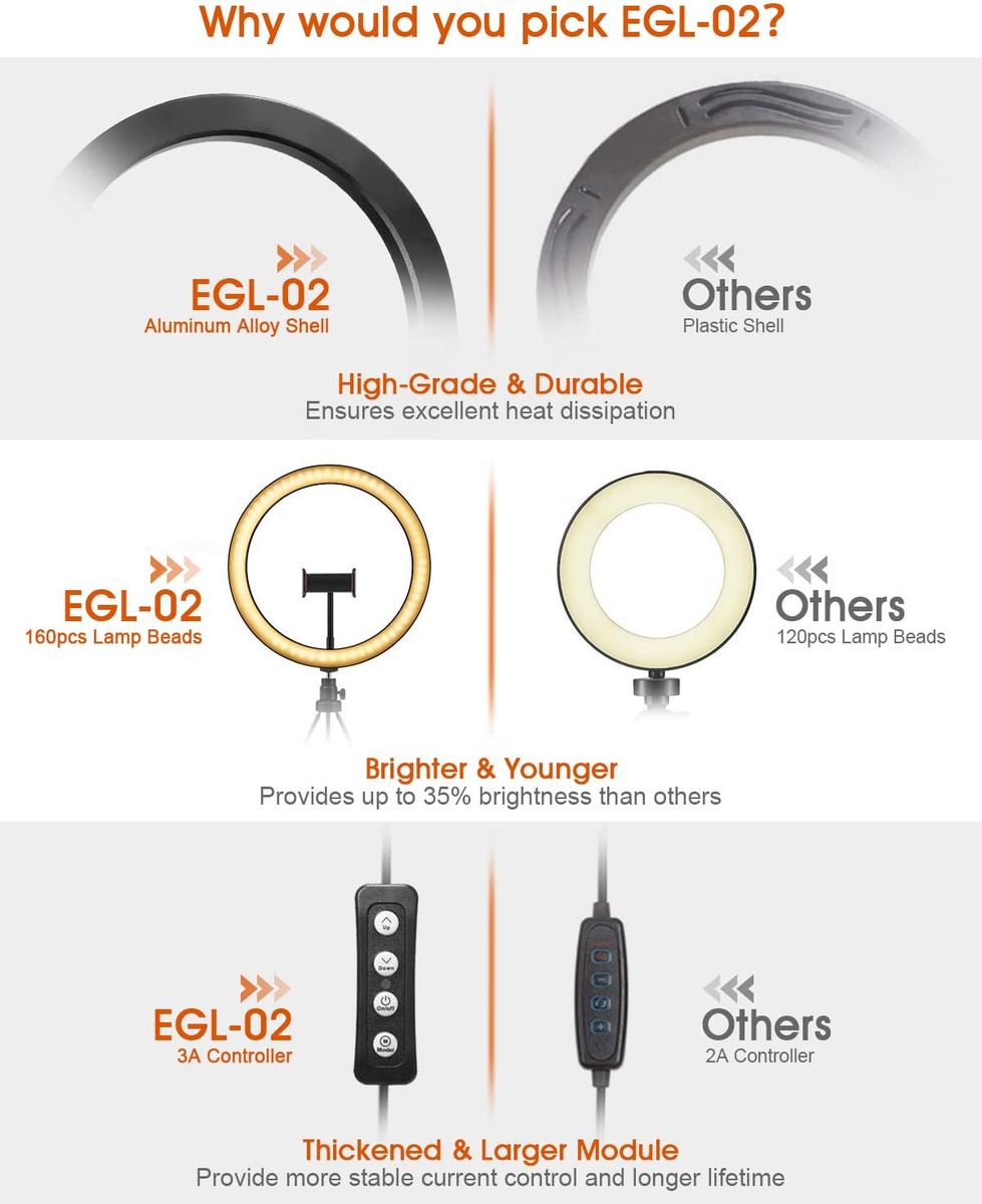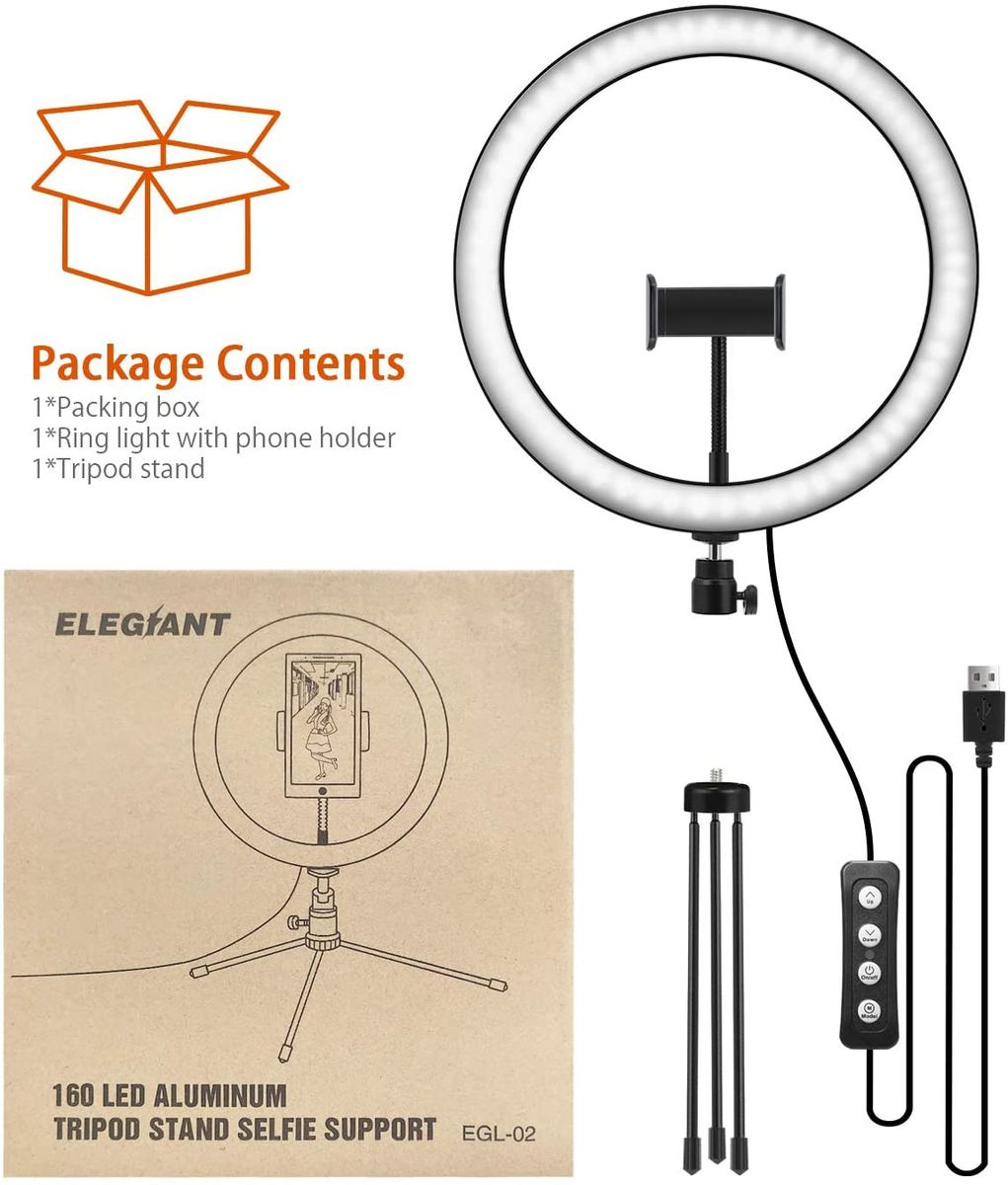 - 【10.2 Inch & Strongest LED Ring Light with 160 LED Parts】: Compared to other selfie fill lights, ELEGIANT mobile phone LED ring light is bigger and more powerful. The ring light is 10.2 inches tall and consists of 160 pieces of LED beads, while another fill light is only 6 inches and has 120 pieces of LEDs. Our color temperature is adjustable from 2700k to 5500K.