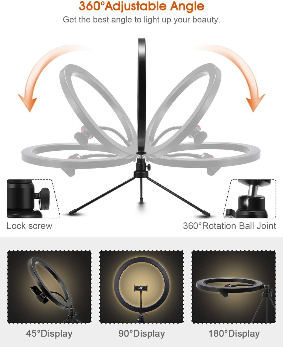 - 【360 ° Rotating Ring Light & Universal Mobile Phone Clamp】: The ring light can be rotated 360 degrees vertically. You can create the three angles according to your needs. The Handyklemme is also adjustable and suitable for most mobile phones, with a screen width of 5.1 to 8.3 cm.