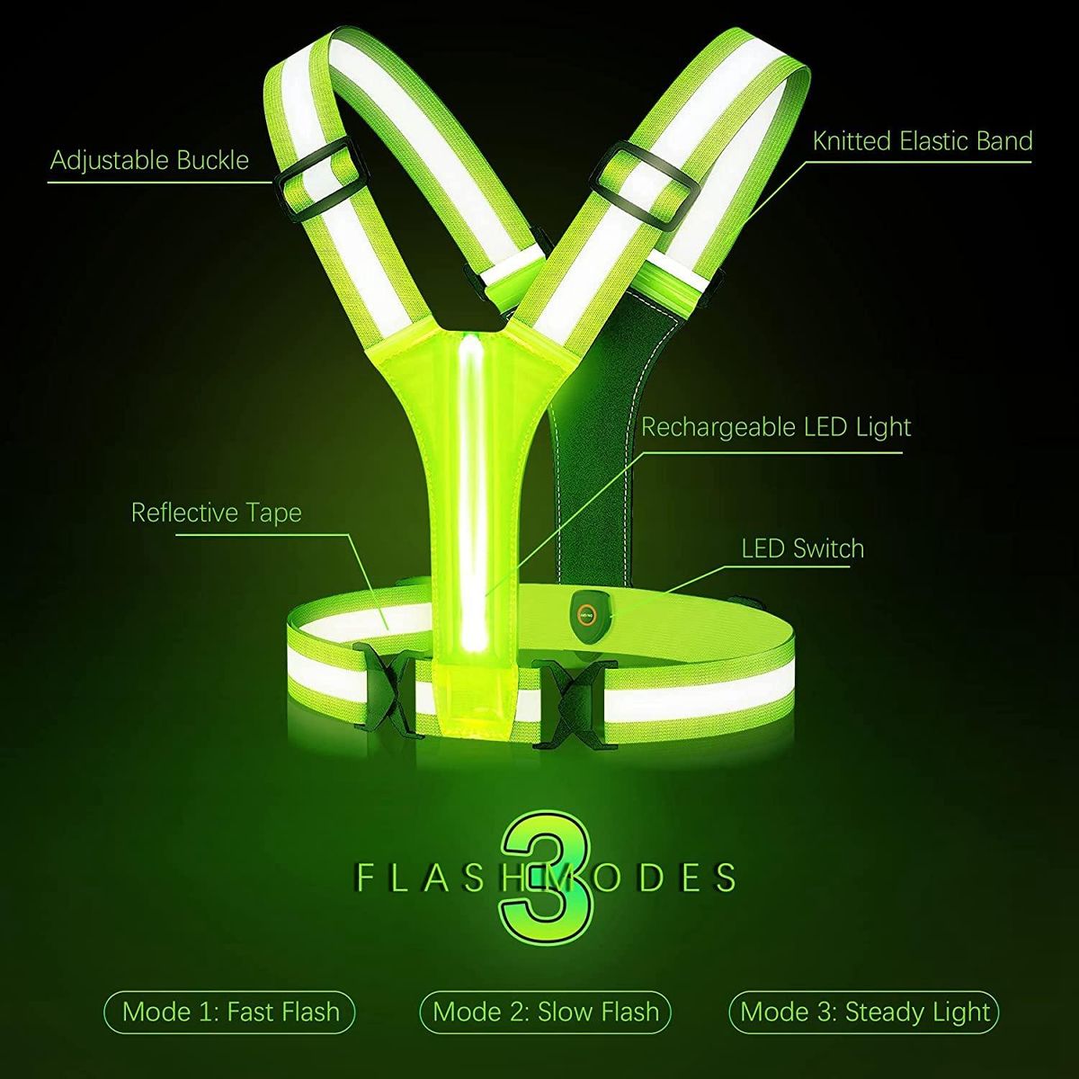 [2 Lights & 3 Modes]There are 2 separate bright LED light strips on the front and back of the reflective running vest. You can be seen in 360 degrees. 2 LED light have 3 modes: always on, fast flashing, and slow flashing. You can choose your preferred light mode by pressing the switch.