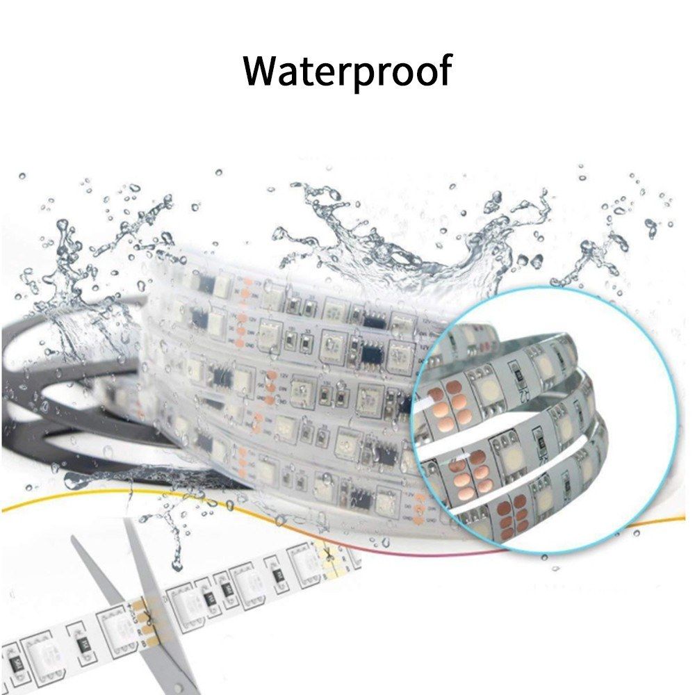 LED Strips: 5050 RGB LED strip light has 300 leds with 2 roll of 5m 150 leds, and with 44 key IR remote controller and 3A 12V power adapter. The strip is waterproof, can be used indoor or outdoor decoration.