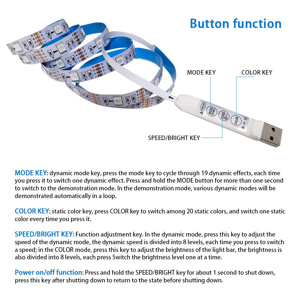 Features:Mini 3 button strip light, press different button to achieve its function in mode/color/speed.