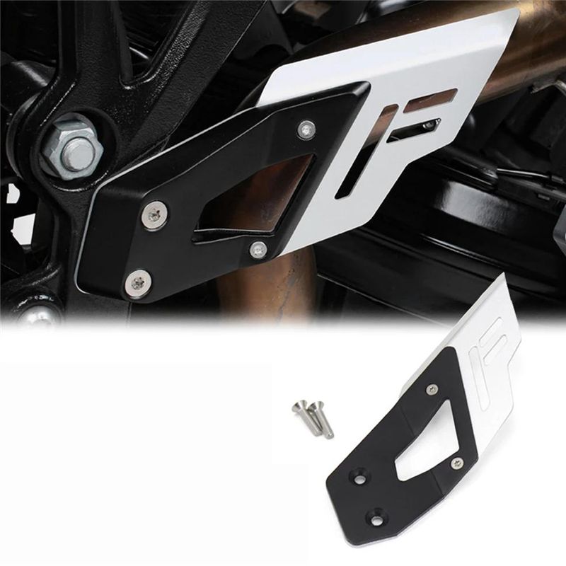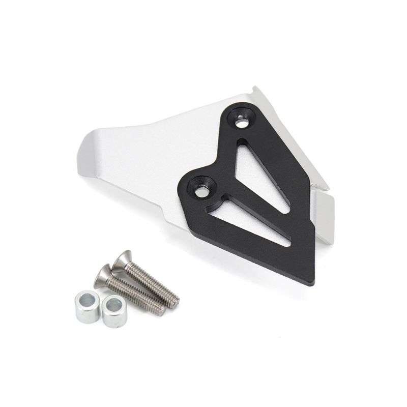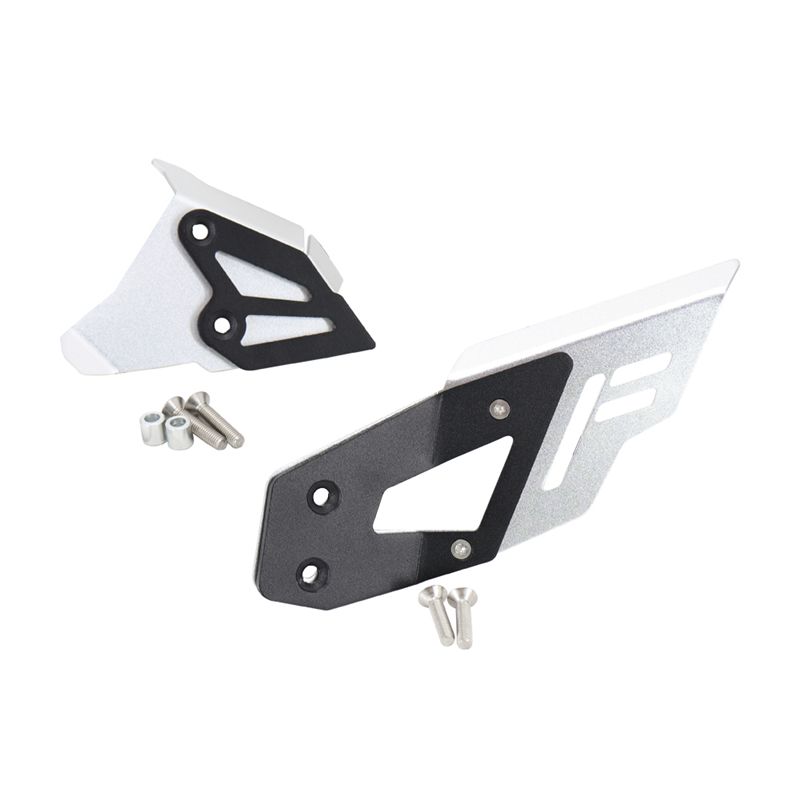Here is the solution for the fragile original plastic heel guards. Optimized by two piece construction; a black texture coated aluminum bracket attaches to the motorcycle's frame and to that, a silver anodized aluminum guard with a stylized on the left side, providing maximum stability and great protection to prevent scuffed boots.