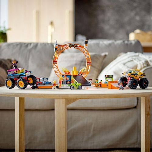 The LEGO® City Stunt Show Arena (60295) playset comes with a flywheel-powered motorcycle and props for spectacular stunt action. Kids can launch the toy stunt bike through a ring of fire, perform backflips and stunts with 2 cool monster trucks and easily reconfigure the stunt modules for different performances. It comes with 6 minifigures, including 3 LEGO City TV characters.A build-and-play experience for kids aged 6 and upThe Stunt Show Arena set includes a printed building guide and Instructions PLUS. Part of the free LEGO Building Instructions app for smartphones and tablets, this interactive guide with zoom and rotate viewing tools really does make LEGO building child's play.Make kids the stars of the show!LEGO City Stuntz sets put kids at the heart of the action, with flywheel-powered bikes, cool vehicles, realistic structures and fun characters that inspire imaginative roleplay. Combine sets from the action-packed LEGO City Stuntz universe for even more fun and excitement!