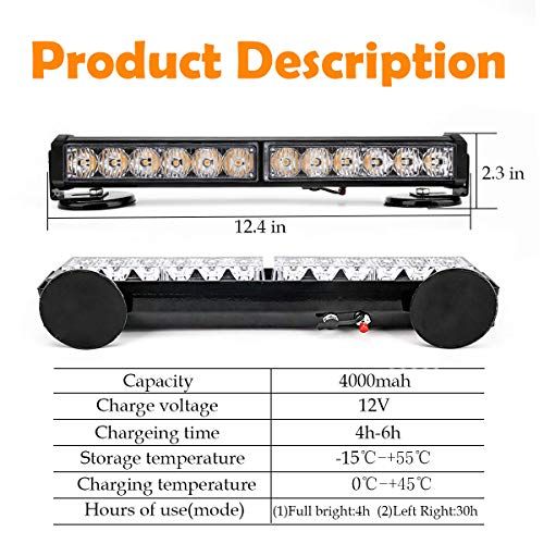 Details: The 12.4 Inh Led Strobe Light baris made of 12 high intensity leds and 4000 mAh Lithium battery.