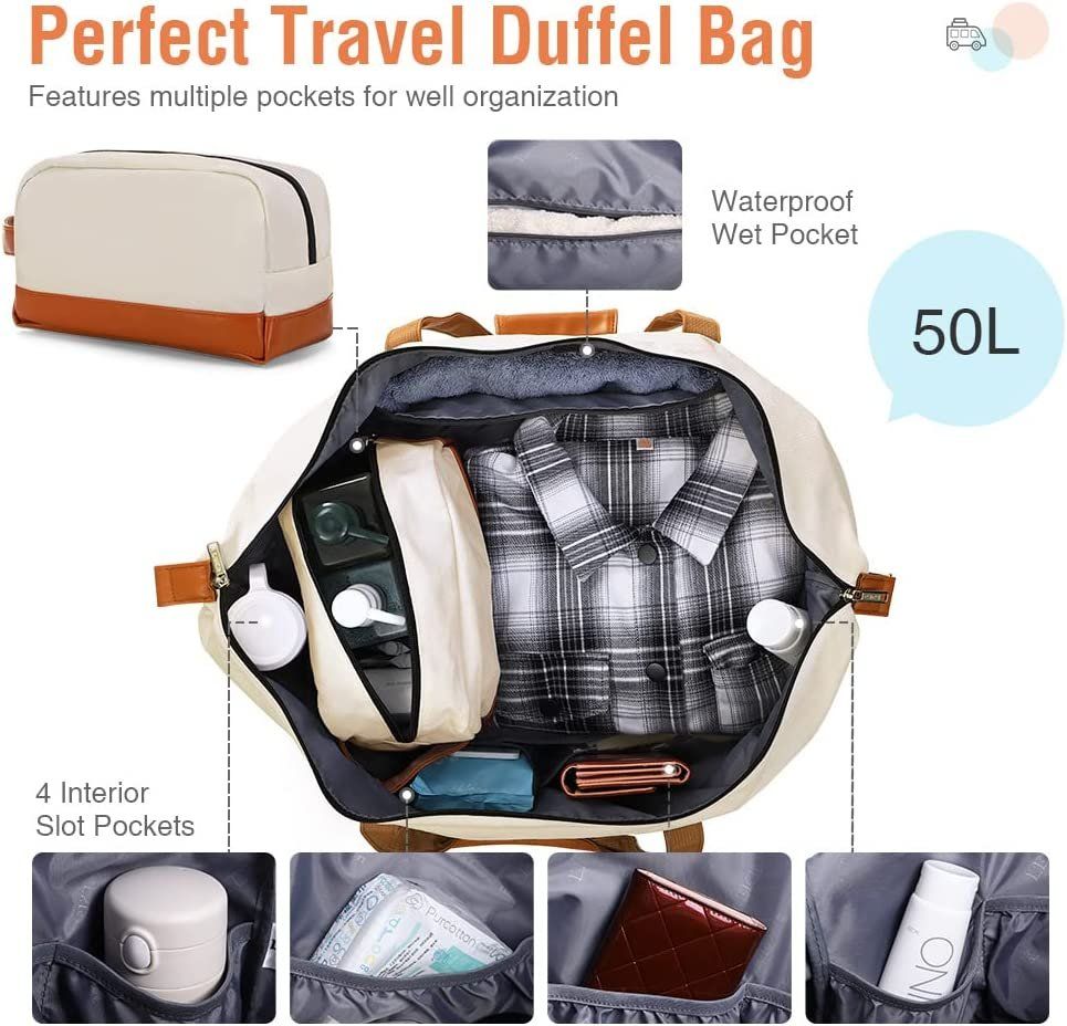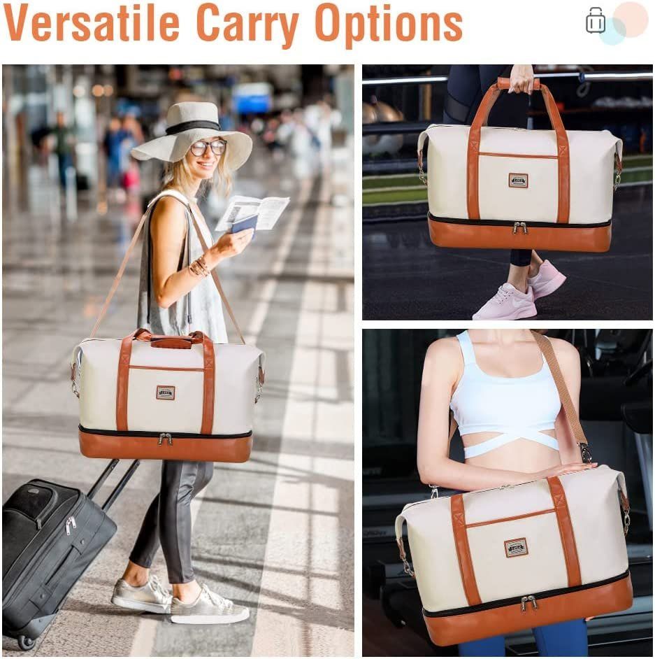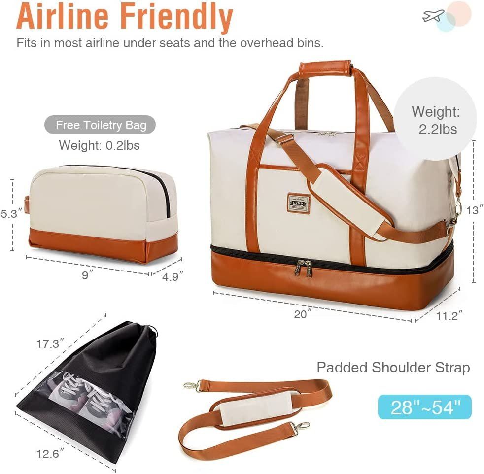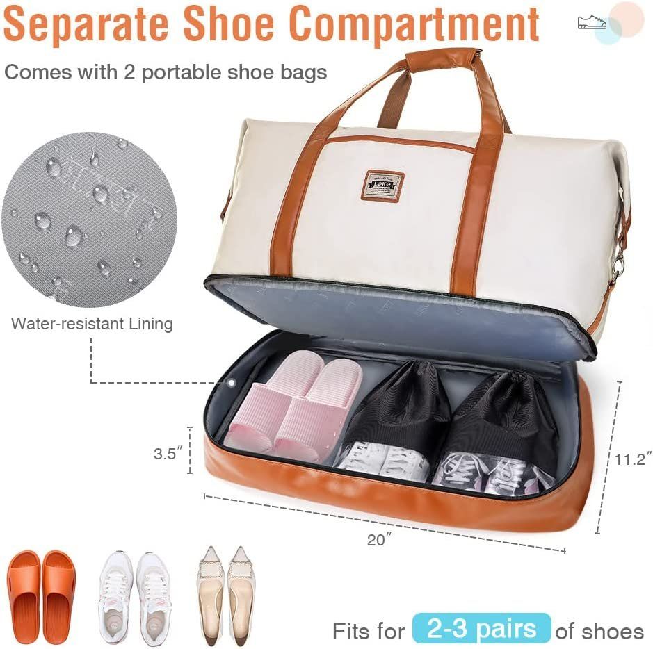 - WEEKENDER BAG WITH SEPERATE TOILETRY BAG & SHOE BAGS: Comes with a handy toiletry bag to store your cosmetics/toiletries, and 2 portable shoe bags for clean shoes or clothes. Separate flat bottom compartment for 2-3 pairs of shoes, saving space for other travel items. Perfect for frequent travelers.