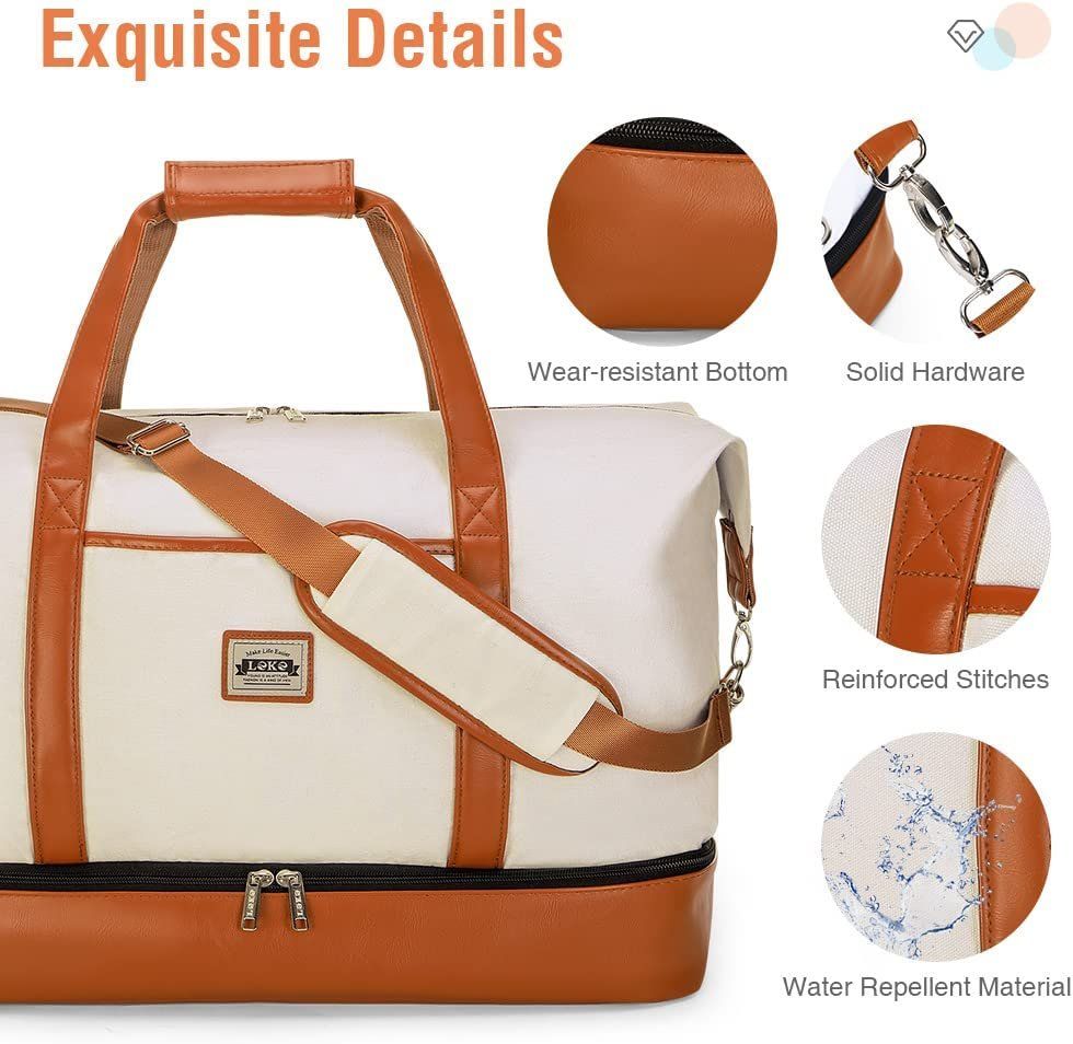 - DURABLE MATERIAL: The material of the travel duffle bag is made of water-repellent Oxford fabric (Also better known as robust fabric in canvas weave) and luxurious faux leather, stylish and elegant, and has great wear-resistant and water repellent performance. Sturdy hooks and reinforced major stress points ensure the weekender bag long-lasting durability.