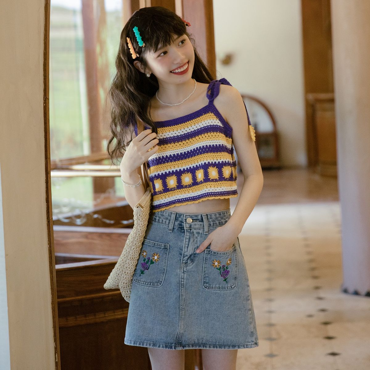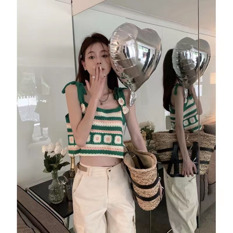 1X OUMEA Women Knitting Stripe Crochet Crop Tops Summer Bow Tied Strap Bright Color Patchwork Floral Casual Sweet Short Tops