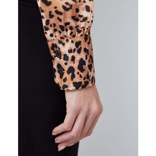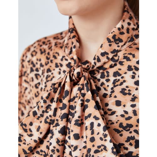Short blouse in woven fabric with a leopard print pattern. V-neck and drawstring at front with narrow, v-neck neckline at the back and short puff sleeves covered elastic at cuffs.