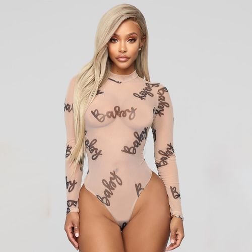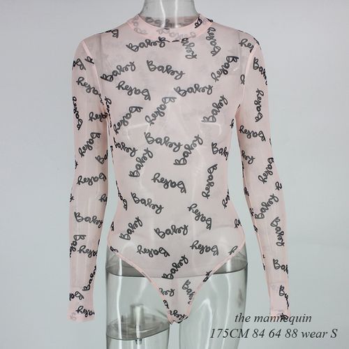 1X Letter Pattern Transparent Mesh Bodycon Bodysuit Rompers Womens Jumpsuit Full Sleeve Turtleneck Sexy Bodysuit Casual