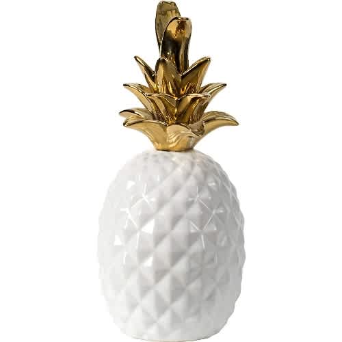 The pineapple has been the universal symbol of warm welcome for centuries. Bring a contemporary touch of hospitality to your home with this ceramic display. Featuring a shiny gold row of leaves on an elegant glossy white finish, this sculpture is sure to announce to your guests. This pineapple matches a variety of styles and decors and adds a touch of cheeky sparkle to your chic office, eclectic living room or tropical sunroom.