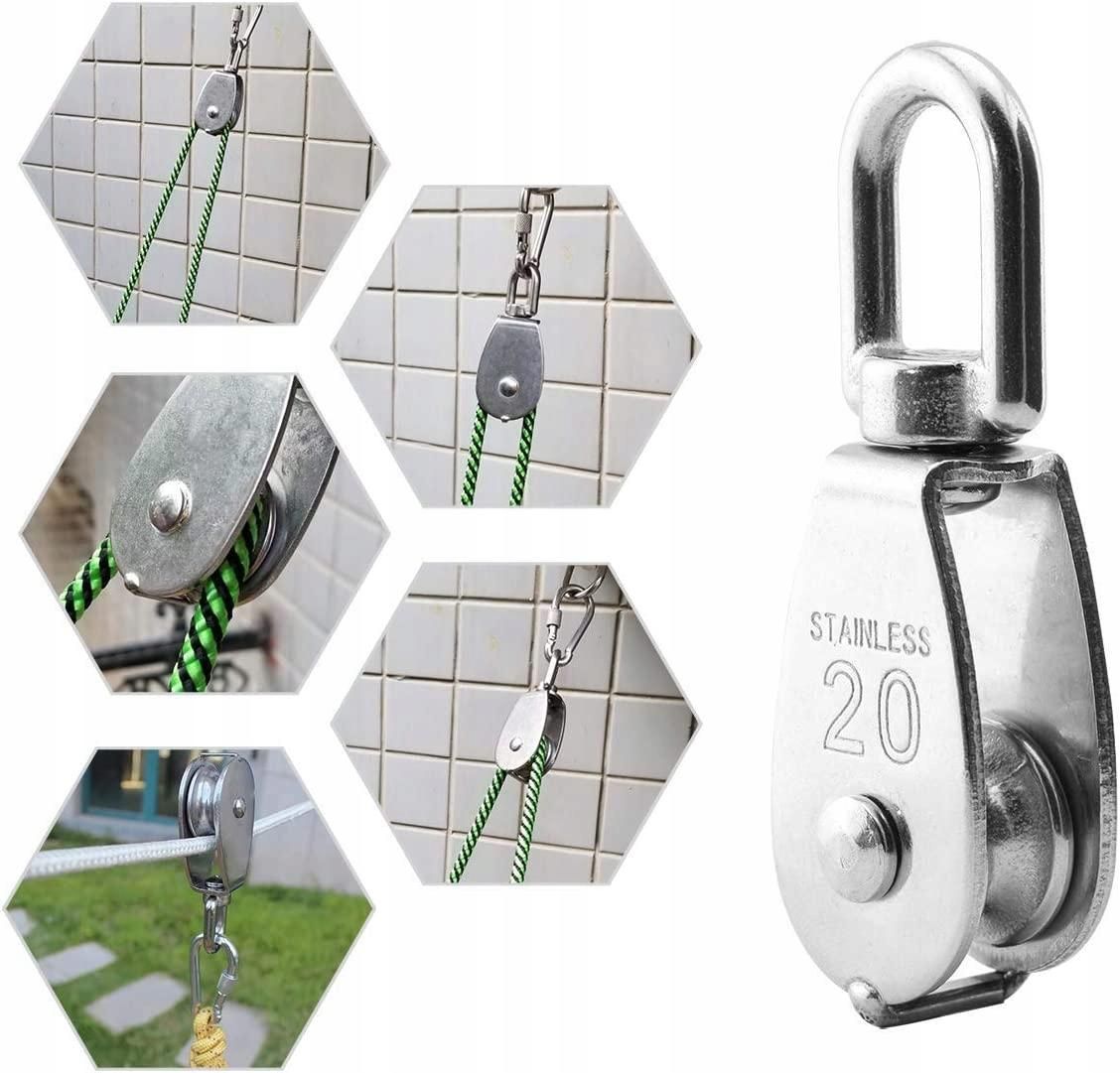 - Function: designed to suspend heavy objects to reduce the load. Rotates 360 degrees to prevent rope knotting and easy to use. The flexible pulley has a high load capacity and is suitable for a variety of applications, with a load of 330 lbs.