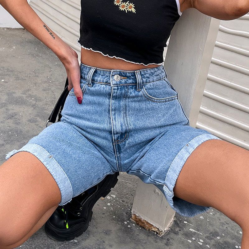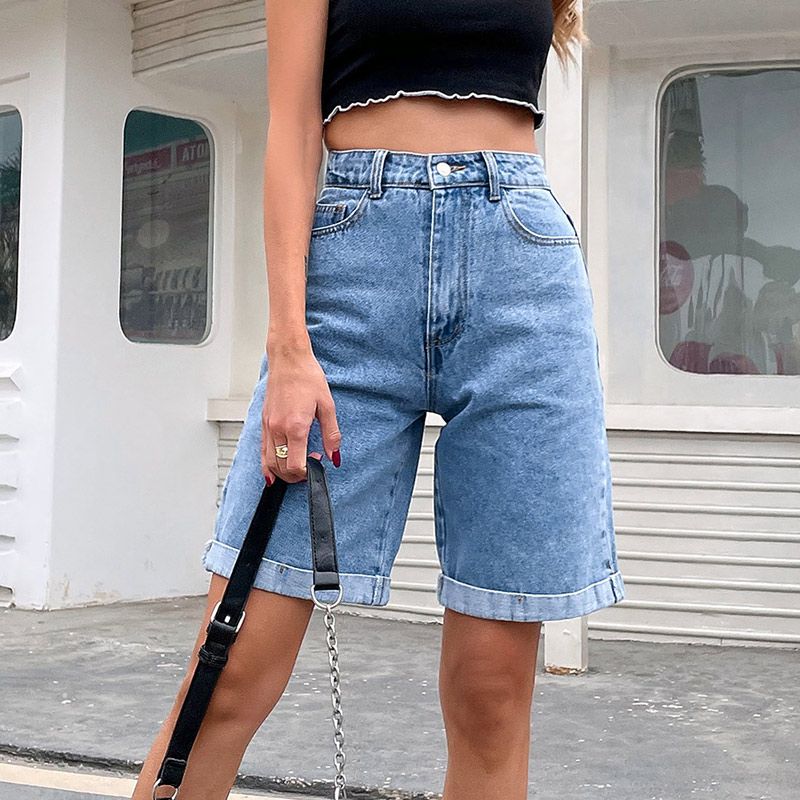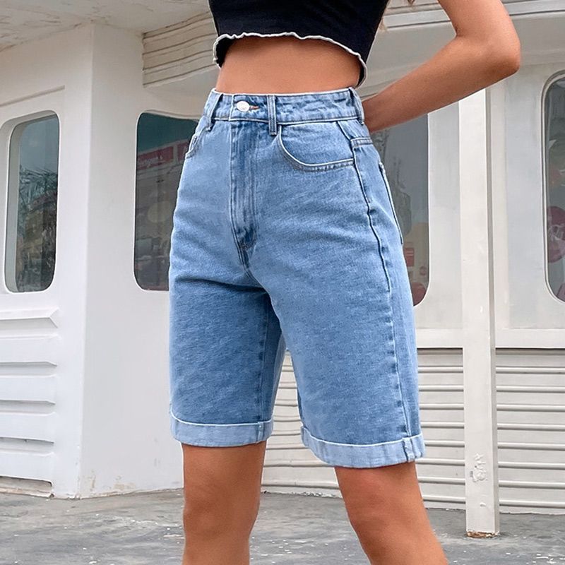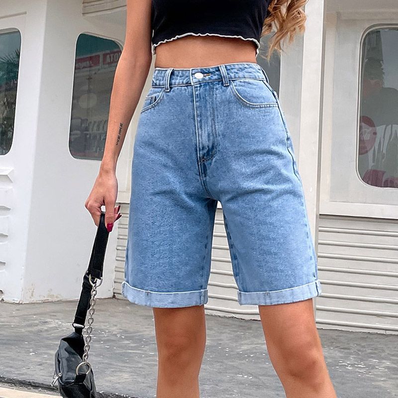 1X Casual High Waist Straight Jeans Shorts 2021 New Summer Pockets Loose Female Blue Denim Shorts Ladies High Street Bottoms
