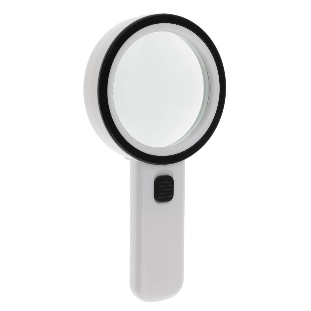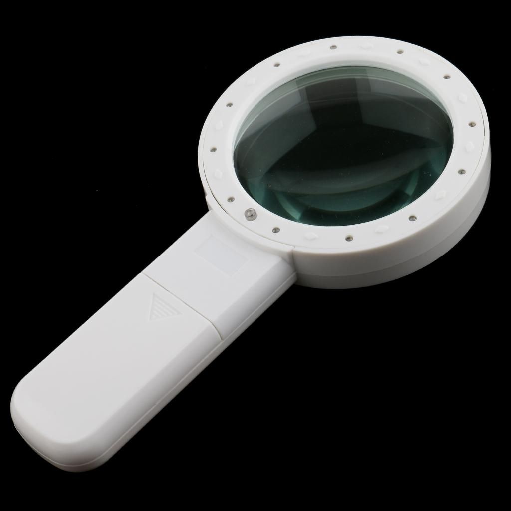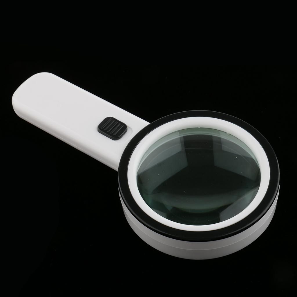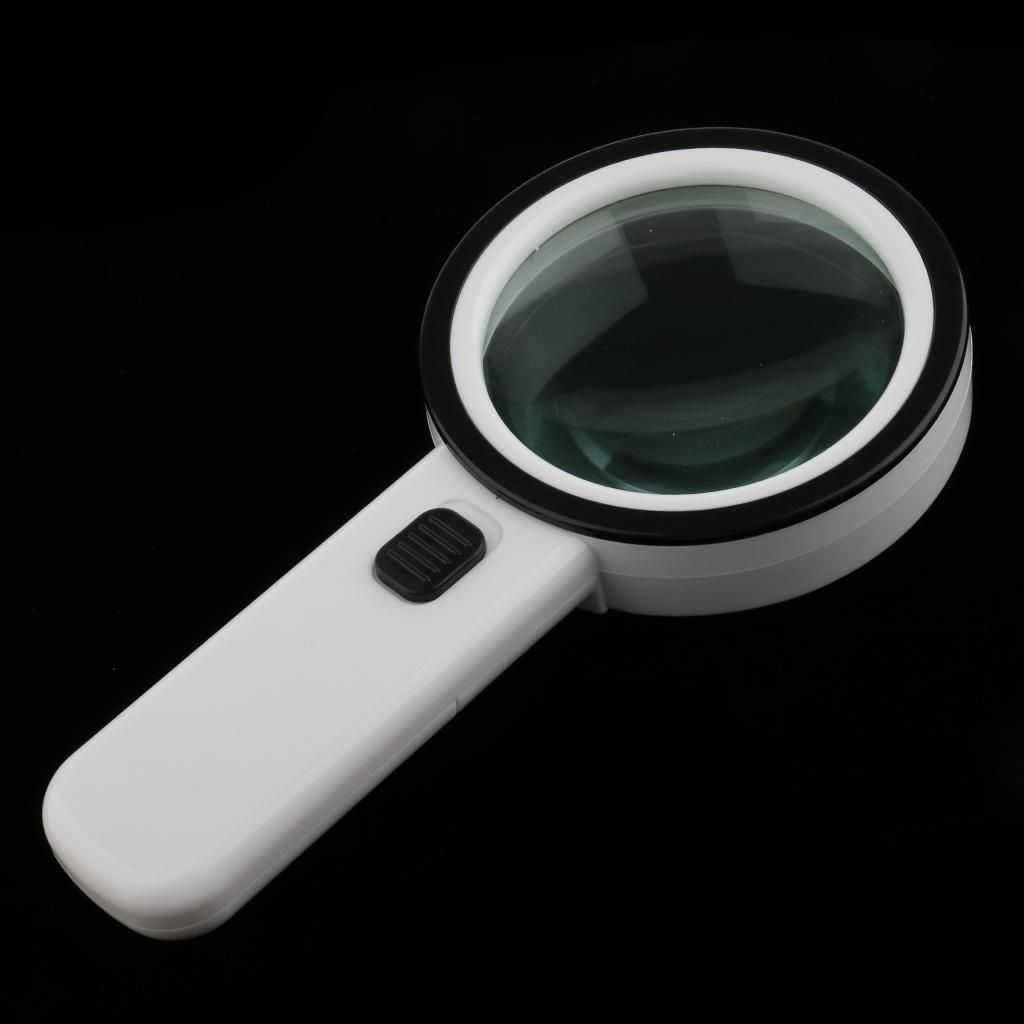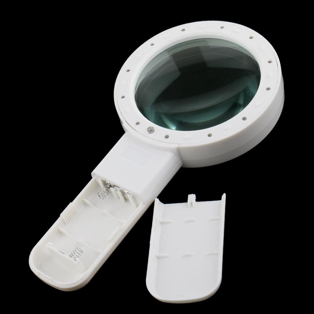 The oversized 10X magnifying glass is ideal for reading books and viewing on a computer screen, while the small auxiliary 10X lens is perfect for examining extremely small texts, images, and objects.Illuminate While You MagnifyEquipped with 12 LED lights built in the handle with UV checking lamp. The lights are bright enough to illuminate text and objects under the magnifying window without being too harsh to the eyes.perfect for nighttime book reading and use in low light applications. The lights run on 2 AA batteries, which can last for a while.Professional Quality Magnifying GlassMade with scratch resistant, shatterproof crystal clear acrylic lens designed for seniors, students, professionals, people with low vision and macular degeneration.Perfect For Your Home, Office or WorkshopIt's a loupe that you can easily slip in a bag or the car's compartment. Portable and tough enough to take with you wherever you go.