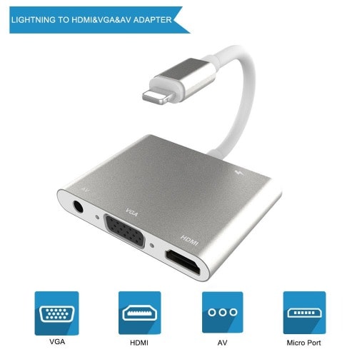 MULTI-FUNCTIONAL:4 in 1 Lightning to HDMI/VGA/AV/3.5mm Audio Port Adapter. Compatible with devices (such as TV, projector, monitor) which is come with HDMI/VGA/AV/3.5mm Audio Port, Support both audio and video output or HDMI & VGA display simultaneously.