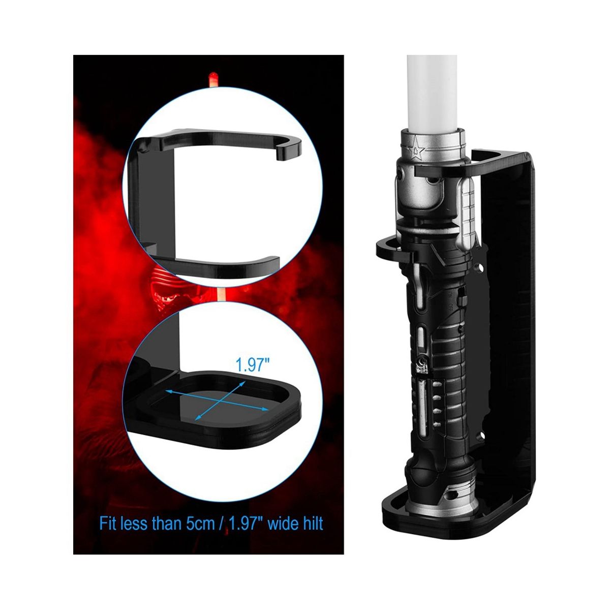 Fits less than 5cm197Inch wide hilt and check if the size is suitable for your lightsaber purchase ATTENTION Wall Mount ONLY Lightsaber is NOT Included