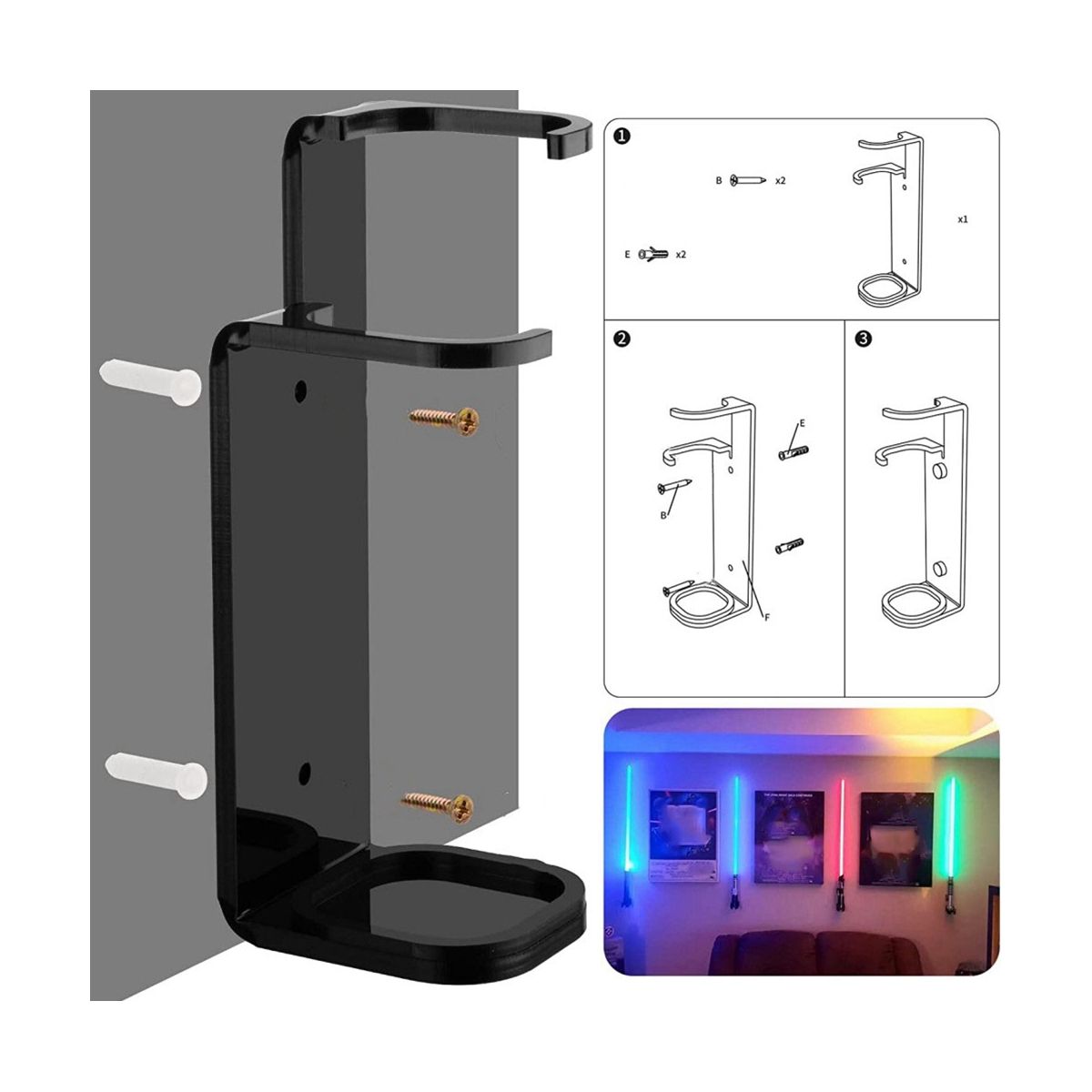 Package comes with complete installation kit and instructions mount the lightsaber rack securely in just two steps screw covers included to hide your screws NoteDrilling required