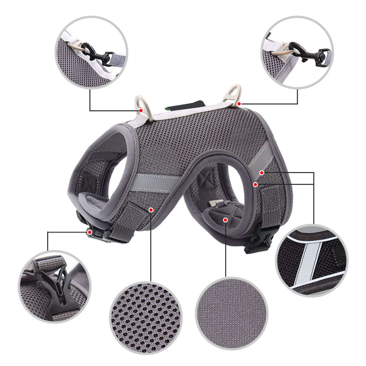 360-degree wrap-around reflective strip to enhance pet visibility in the early morning or evening. Fastener tape design on the back and adjustable clips provide a comfortable environment.