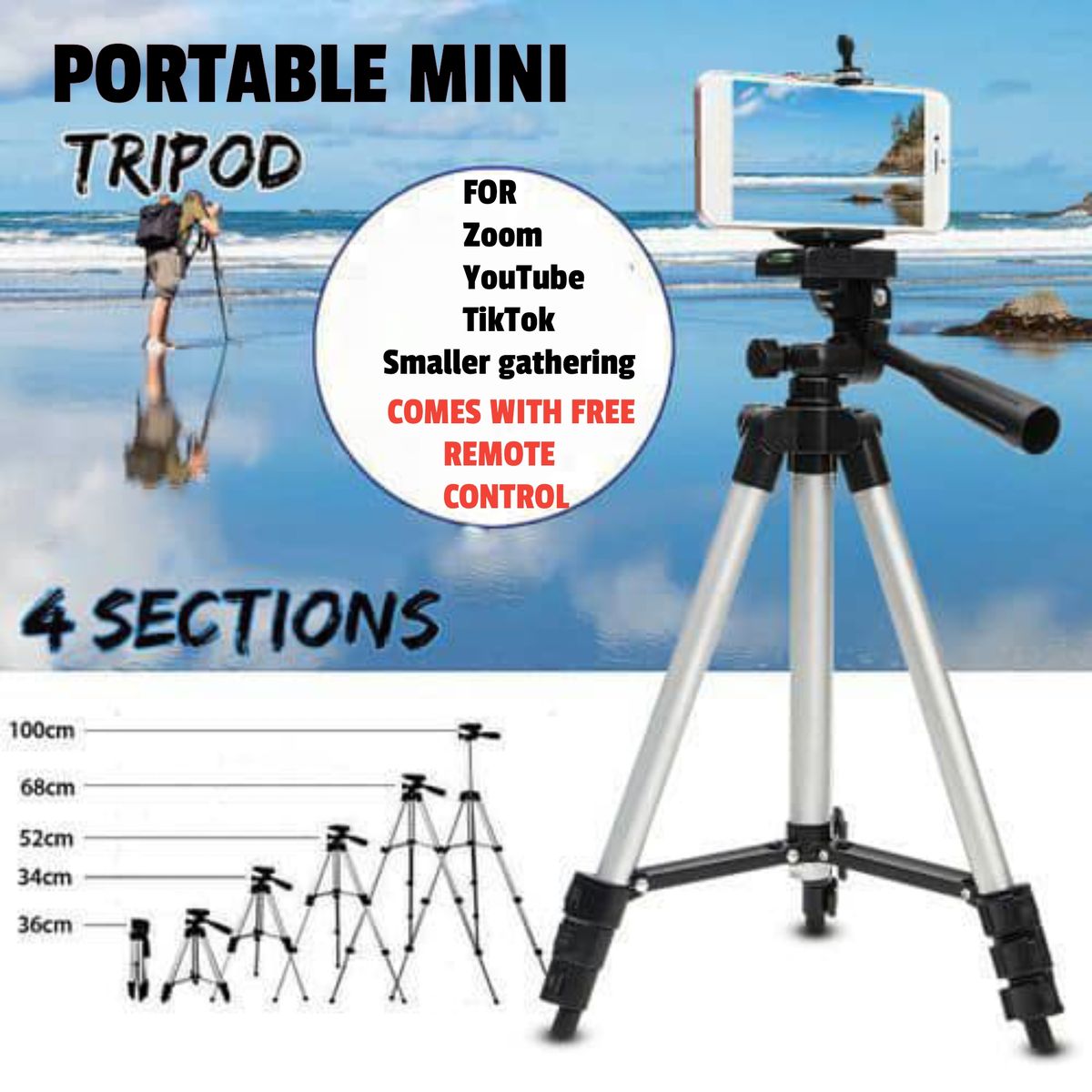 Tripod is perfect for taking photos in birthday party, family dinner, company celebration, camping or sightseeing. Made of the finest aluminum alloy with only 0.8lbs (360g), super lightweight to carry. Non-skid rubber feet for uneven ground. Special triangle stabilize structure to hold up more weight up to 4.4lbs (2.0kg), strong enough for iphone/Galaxy/Huawei or other brand smartphones, Gopro and entry-level SLR.. A universal Bluetooth helps to taking photos at a distance of up to 30 feet. A universal smartphone holder that fits for almost every kind of phones in the market and a standard Gopro mount.. Order for this now on