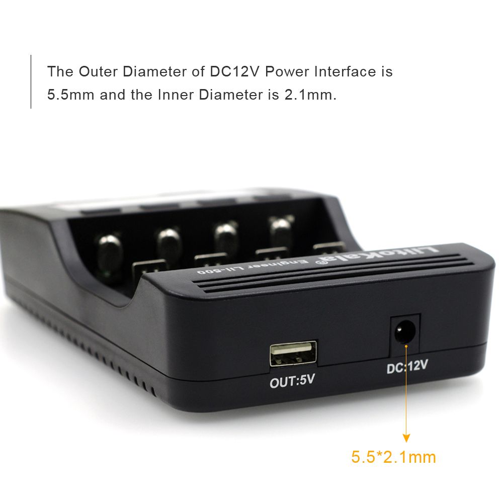 Suitable for: 3.7V Li-ion & 1.2V Ni-MH cylindrical rechargeable battery of size between: (diameter: 0-22mm, height: 34-70mm)