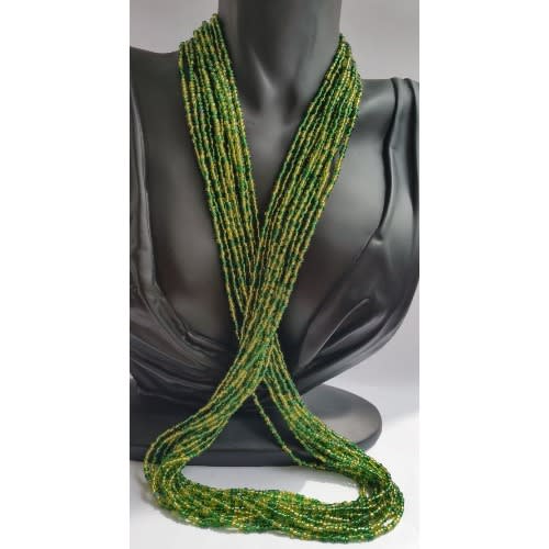 This handmade multicoloured glass bead necklace is 91cm long. It is made up of 12 strands, each finished with a pewter screw clasp. It can be worn as a simple long multi-strand necklace, doubled up for a fuller fit, or layered. With this necklace, there are endless possibilities.
