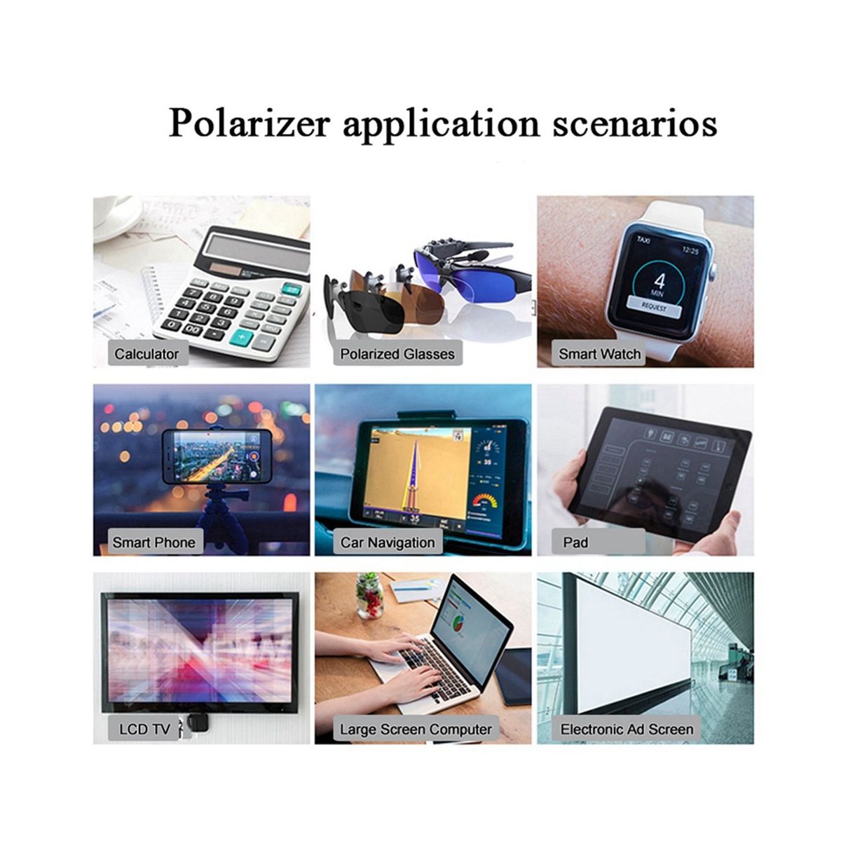 Good quality Linear polarizer film for 3D glasses/Mirror/Magic show /projectorIt is an important part to help display the image,which is widely applied in any field.The polarizer film does not need to be replaced each time,Unless the polarizer film has scratches;If you are a Beginner, it is recommended to use a professional Polarizer remover machine and film laminating machine to replace the polarizer film.High polarized efficiency, high transmittanceColour:blackMaterial:TAC+PVASize:10 x 10cm, thickness: 0.13mmPackage Contents:5x Polarizing Film SheetOnly the above package content, other products are not included.Note: Light reflection and different displays may cause the color of the item in the picture a little different from the real thing. The measurement allowed error is +/- 1-3cm.