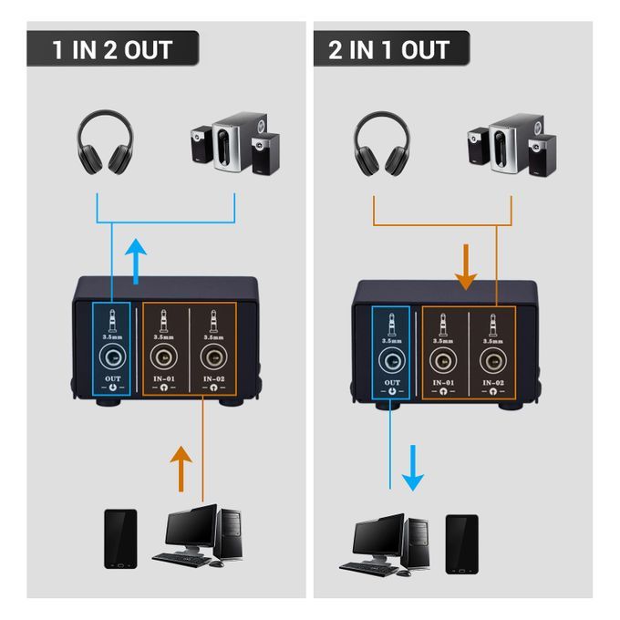 If you got tired of plugging/unplugging your headphones and computer speakers, then there is a solution for you! This is a non-powered audio switch that enables one input to one-of-two devices or one output from one-of-two inputs.