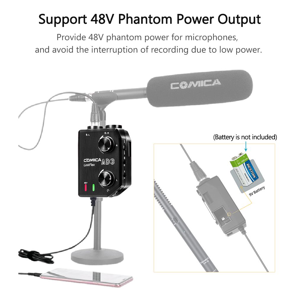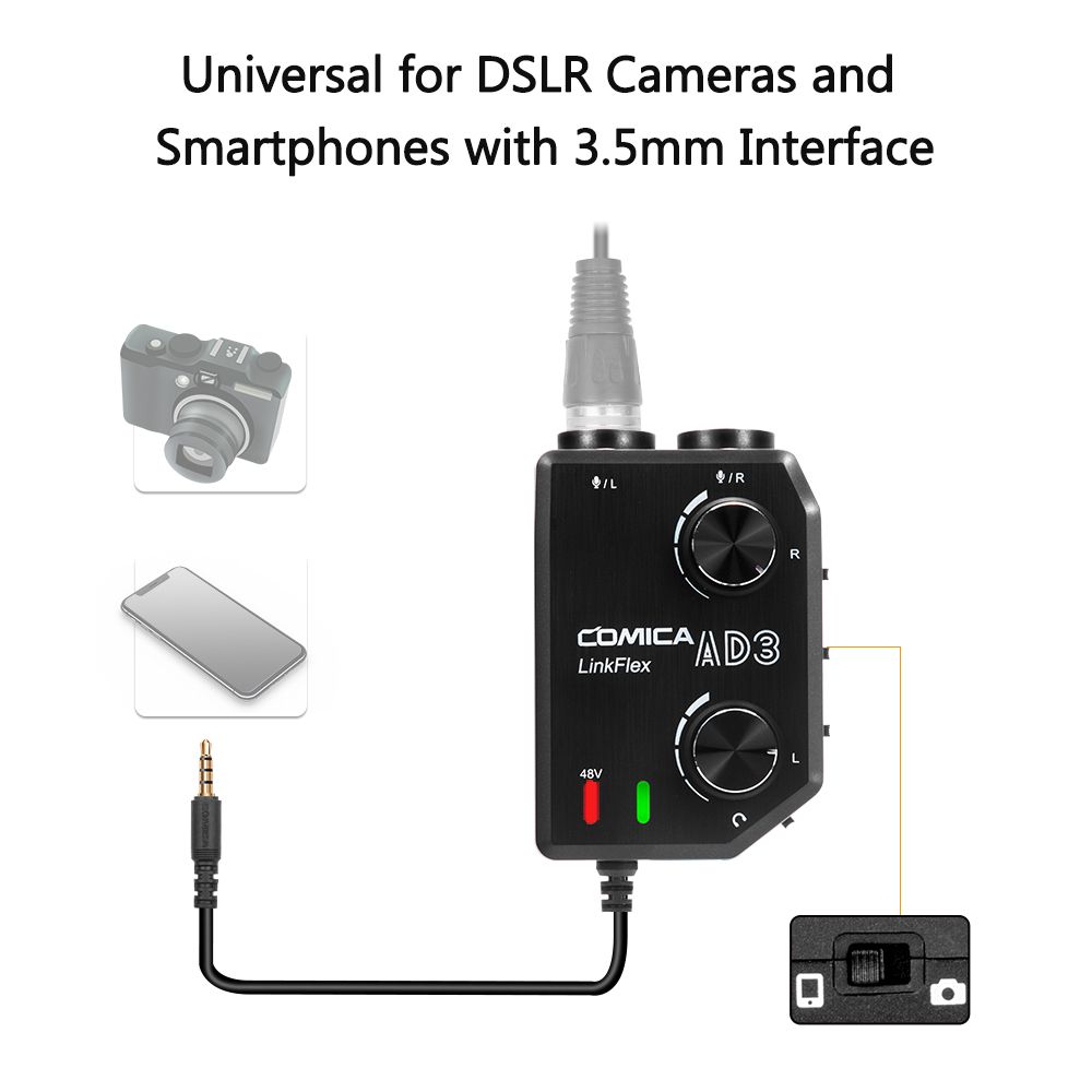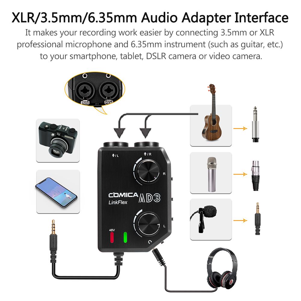 XLR/3.5mm/6.35mm Audio Adapter Interface: CoMica LINKFLEX AD3 makes your recording work easier by connecting 3.5mm or XLR professional microphone and 6.35mm instrument (such as guitar, etc.) to your smartphone, tablet, DSLR camera or video camera.