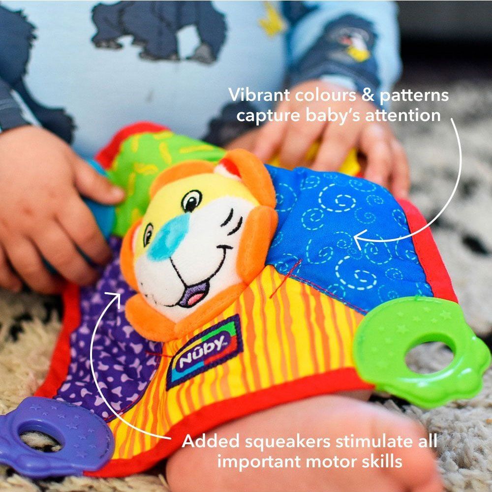 The Nuby™ Teething blanket is designed to comfort and soothe your toddler through the teething process. The multiple teething surfaces on each corner allow your baby to chew and cut their first teeth, relieving sore and sensitive gums. The blanket crinkles and squeaks with a gentle squeeze of the soft fun characters and helps stimulate your baby's senses and imagination.