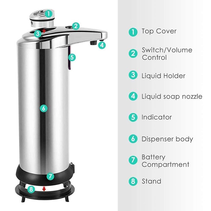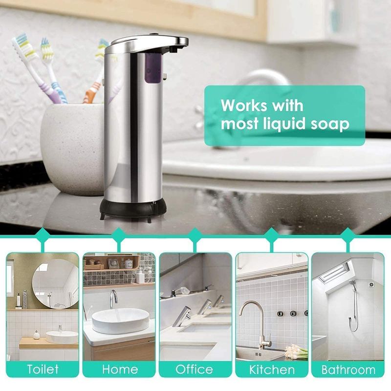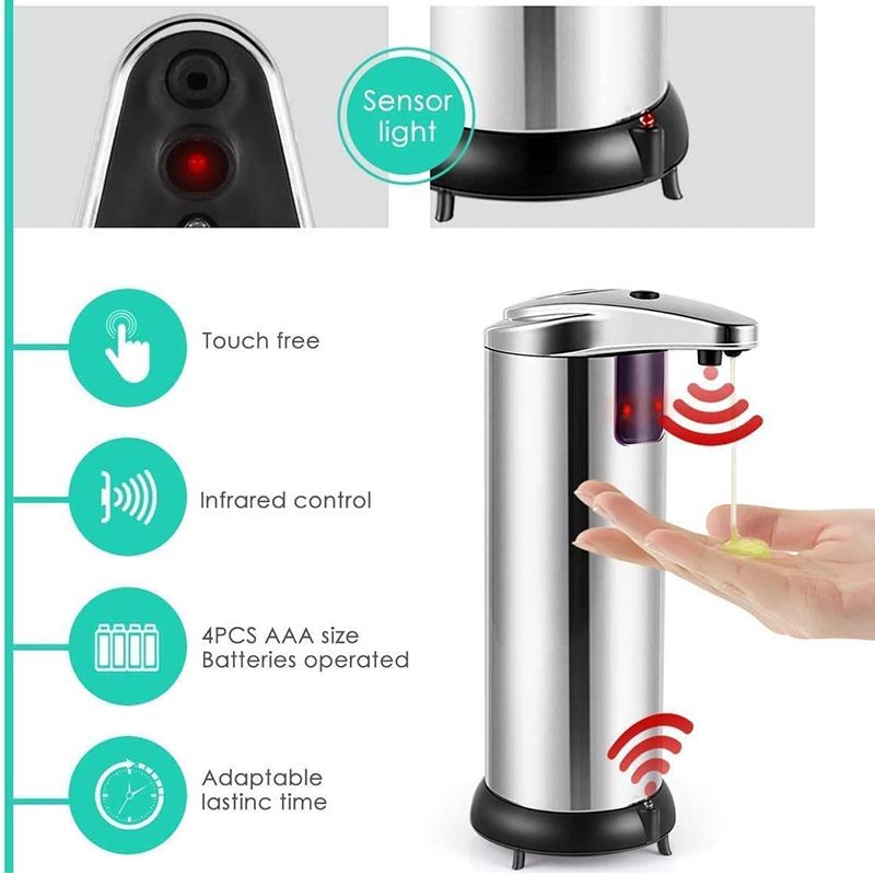 Features: 1. Automatic Stainle Steel Sensor Infrared Handfree Soap Sanitizer Dispenser 2. This item has built-in infrared smart sensor, soap will come out automatically once laying your hand, dishware, etc. under the spout. 3. It's perfect to use at bathroom, kitchen, office, school, hospital, hotel and restaurant. 4. Built-in infrared smart sensor. 5. Fully automatic and touch-free operation, to avoid the second cro-infection. 6. Innovative non-drip design eliminates waste and countertop me. 7. Large, easy to fill opening. 8. Convenient, adaptable lasting time. 9. Ideal for lotions liquid soaps or sanitizers, etc. 10. Perfect to use at bathrooms, kitchens, office, school, hospital, hotel and restaurant. 11. Cordle, powered by 4 AAA batteries (NOT Included) Packing content: 1 x Automatic Soap Dispenser 1 x Instruction Manual