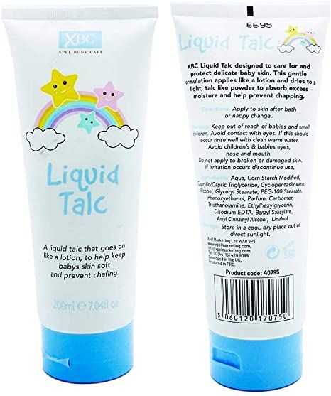 XBC Liquid Talc is designed to care and protect delicate baby skin. This gentle formulation applies like a lotion and dries to a light, talc like powder to absorb excess moisture and help prevent chafing.