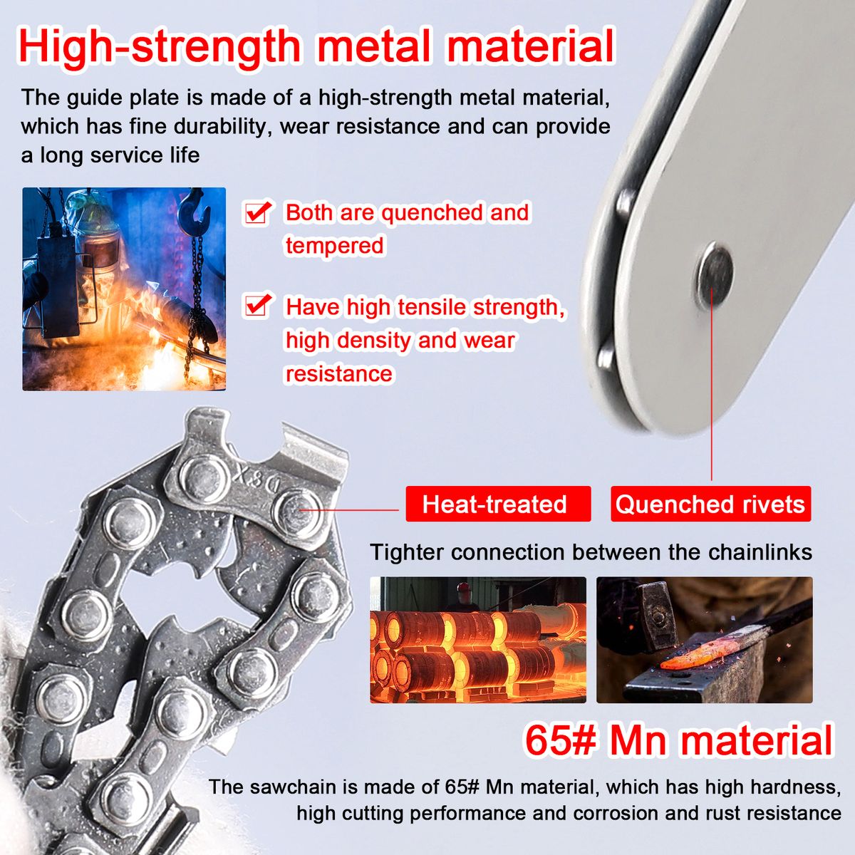 The sawchain is made of 65# Mn material, which has high hardness, high cutting performance and corrosion and rust resistance.