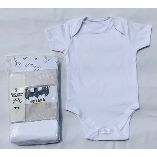 Bodysuits are made of 100% cotton for the softest touch on your baby's gentle skin. Bodysuits are essential to any baby's wardrobe, and these bodysuits are so comfortable that they can be used as underwear or even on their own. Assorted with printed designs, sayings, and prints; available in boy and girl designs and fits up to 12 months.