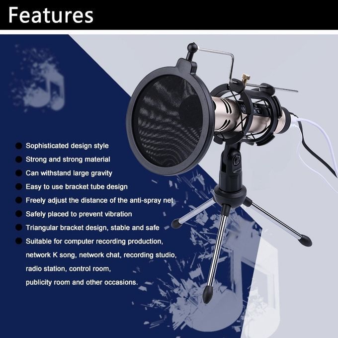 1. The stand can be clipped to the microphone and equipped with a professional recording blowout hood.2. It is Applicable to computer recording production, network k song, network chat, recording studio, radio station, publicity room and other occasions.3. Freely adjust the distance of the anti-spray net, safely place it, reject the vibration, and be safe and secure.4. Note: This product has only a bracket and does not contain a microphone.