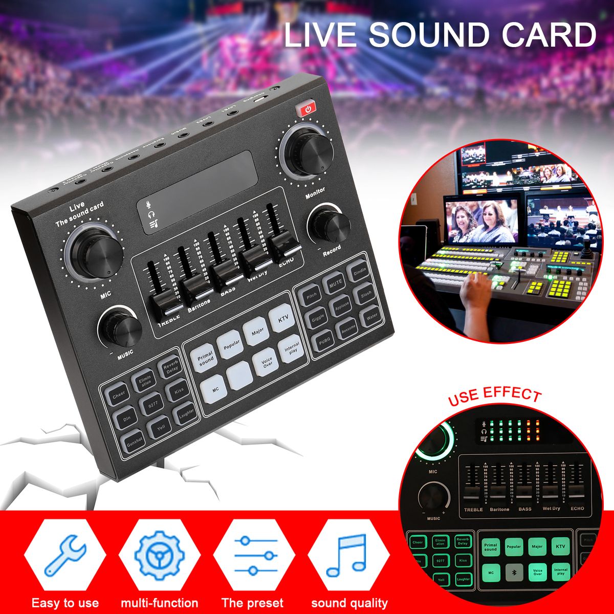 Sound Card:- Tuning knob design, with 12 kinds of electricity sound and 14 warming up sound effects, support elimination of originalsound, live singing, one-button avoidance, real-time monitoring.