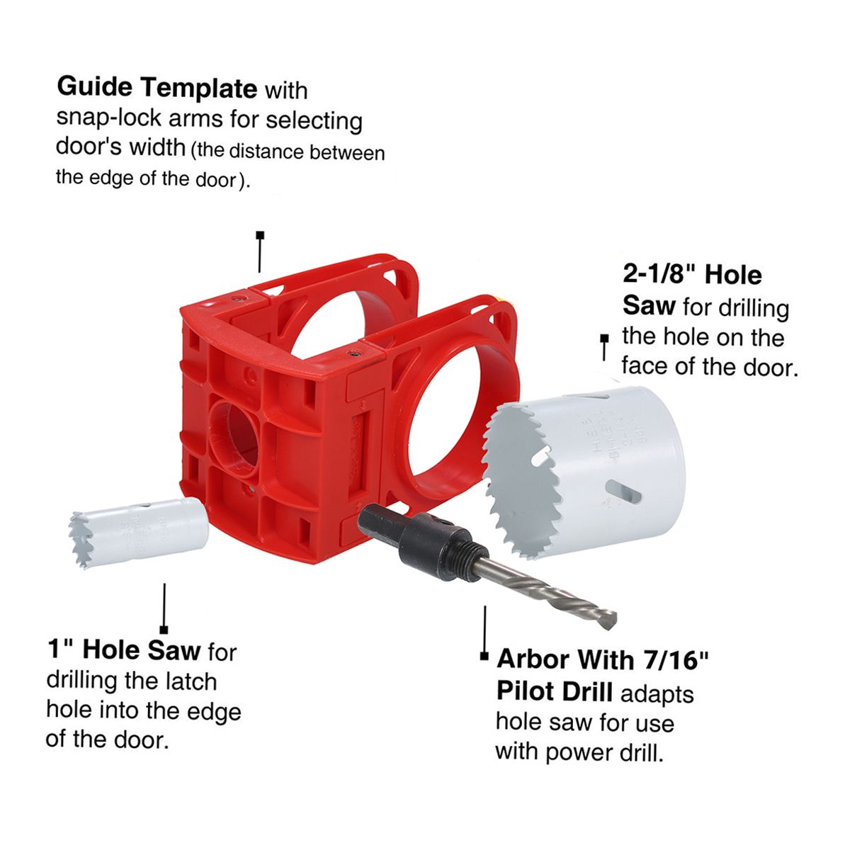 Package Include -- Auto-Centering Drill Guide, 2-1/8inch Hole Saw, 1inch Hole Saw, 7/16in Drill Bit.