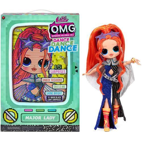UNBOX 15 SURPRISES including LOL OMG Surprise Dance Dance Dance OMG fashion doll Major Lady, including a black light to reveal additional glowing surprises. A great gift for girls age 4-9