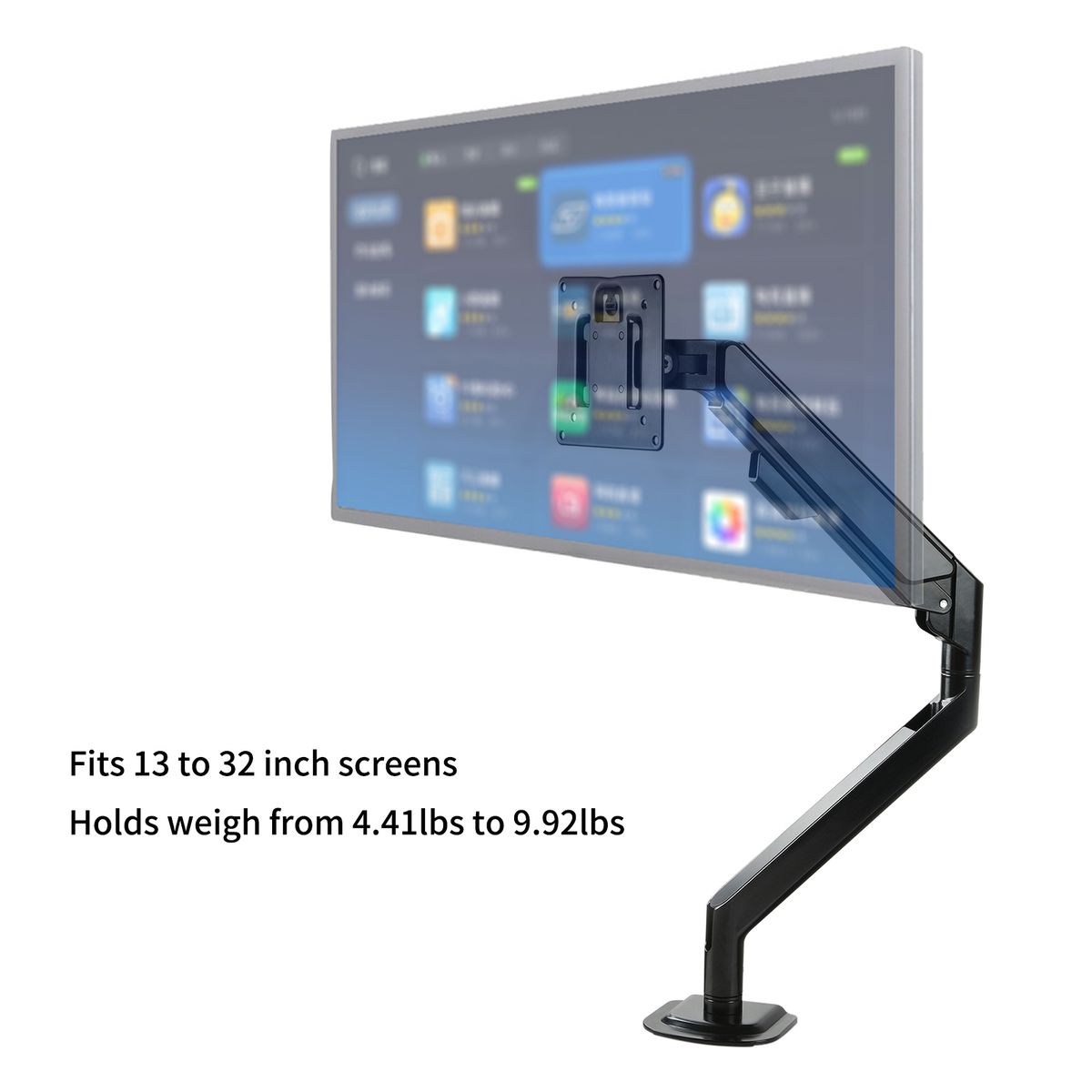 Securely holds monitors weighing from 4.41bs to 9.92lbs.