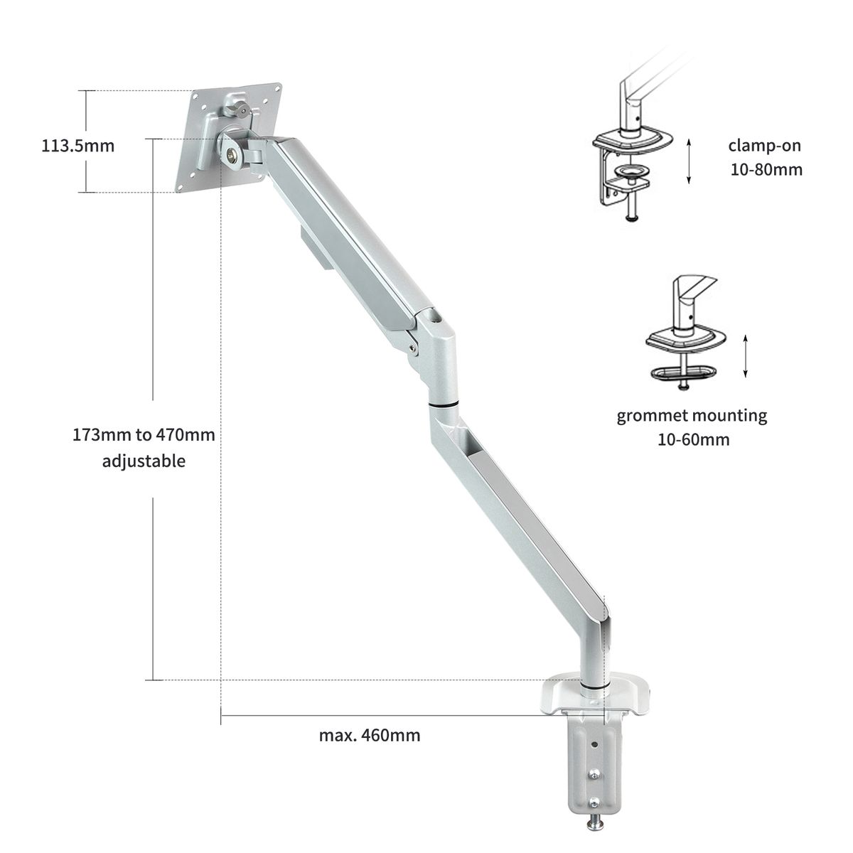Monitor stand supports both clamp and grommet mounting methods.